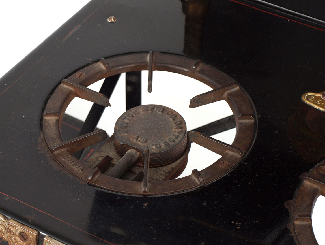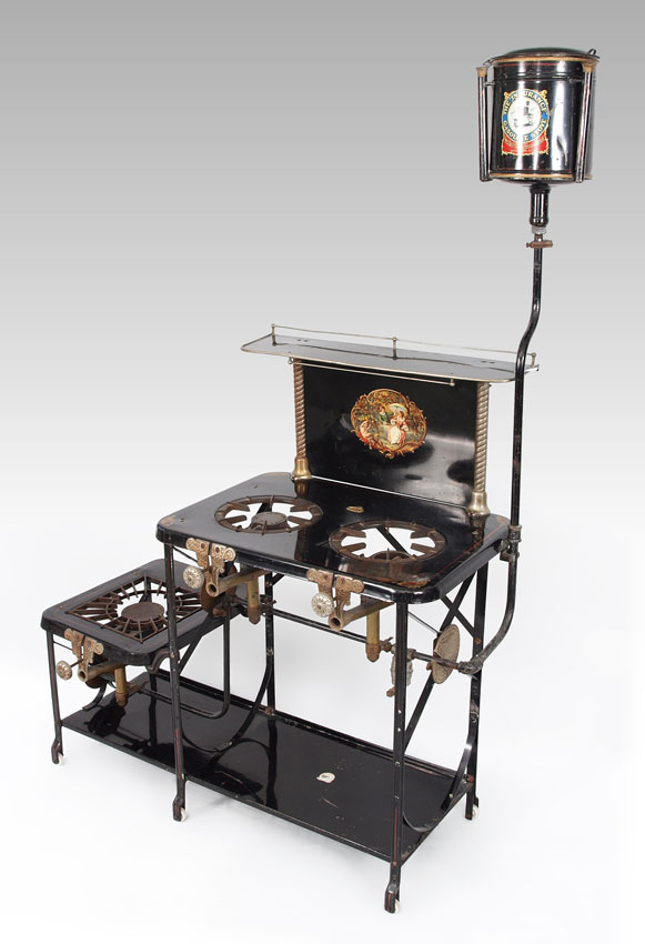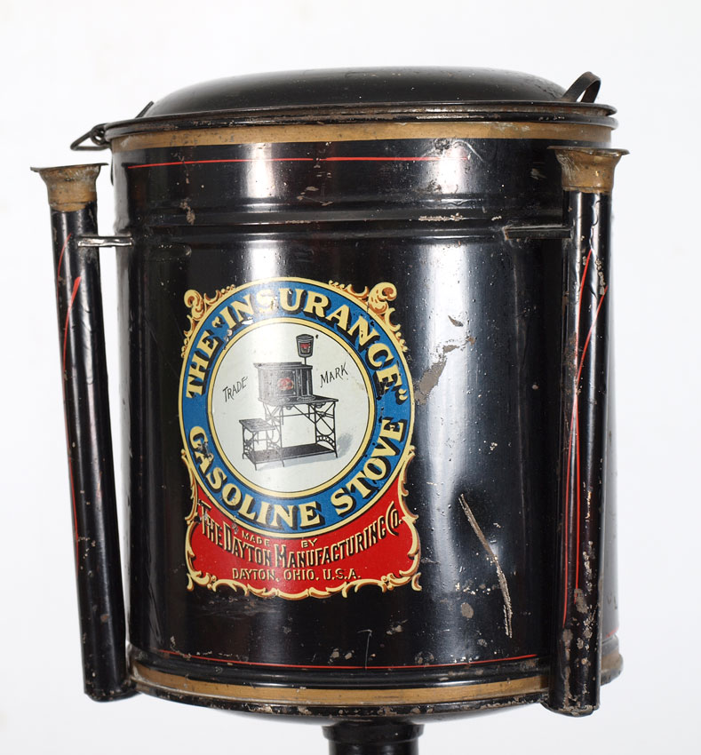 DAYTON MFG. THE INSURANCE GASOLINE STOVE: Enameled black metal with gasoline receiver above by the Dayton Manufacturing Company. Retains original decals. 62 1/2'' h. x 40'' x 20''.