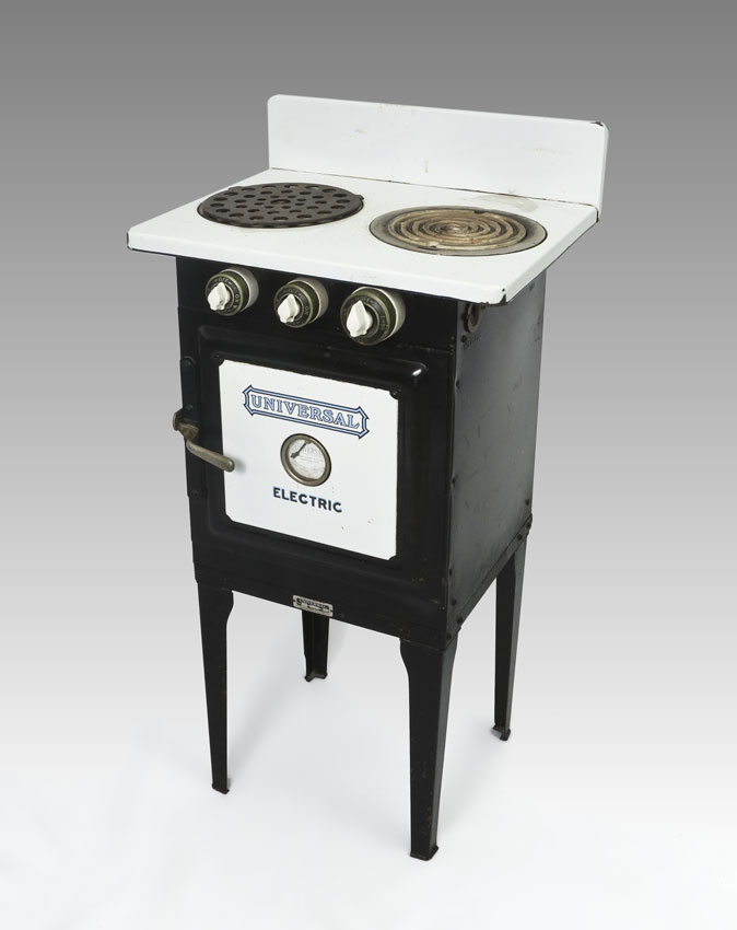 EARLY 20TH CENTURY UNIVERSAL ELECTRIC STOVE: Porcelain to with 2 burners, porcelain front to oven door reads ''Universal Electric'' with inset thermometer. All on 4 legs. Original plug inside oven, 2 outlets, one for burners, one for stove, as a safety feature both cannot be operated at the same time. 37 1/2'' h. x 19'' x 16''.