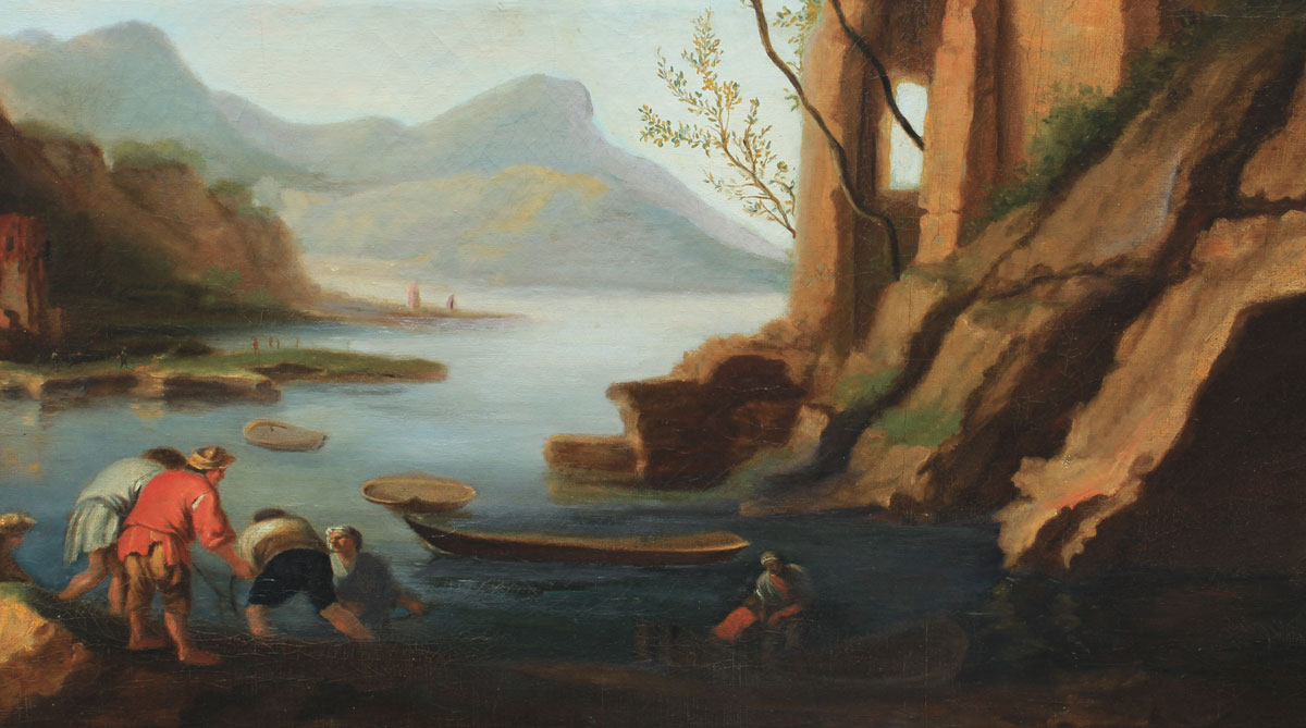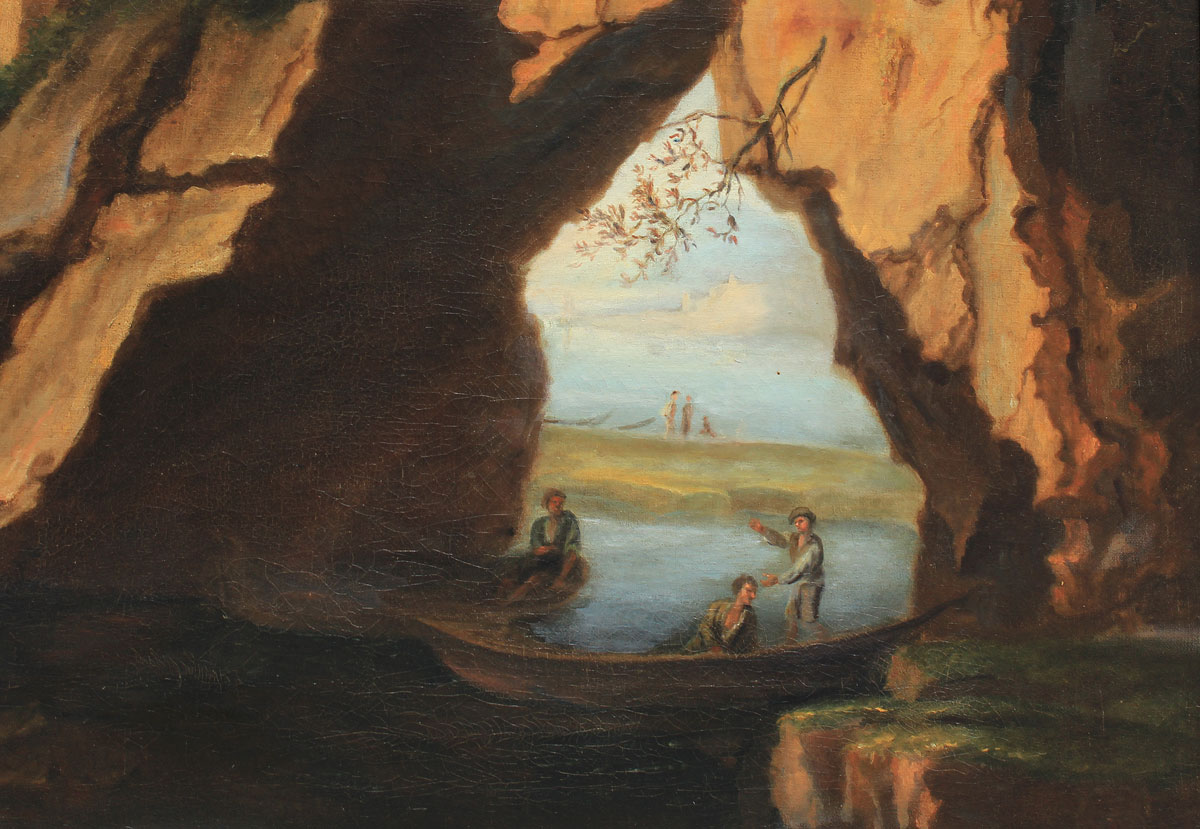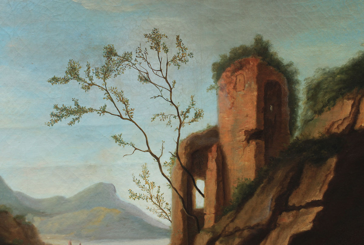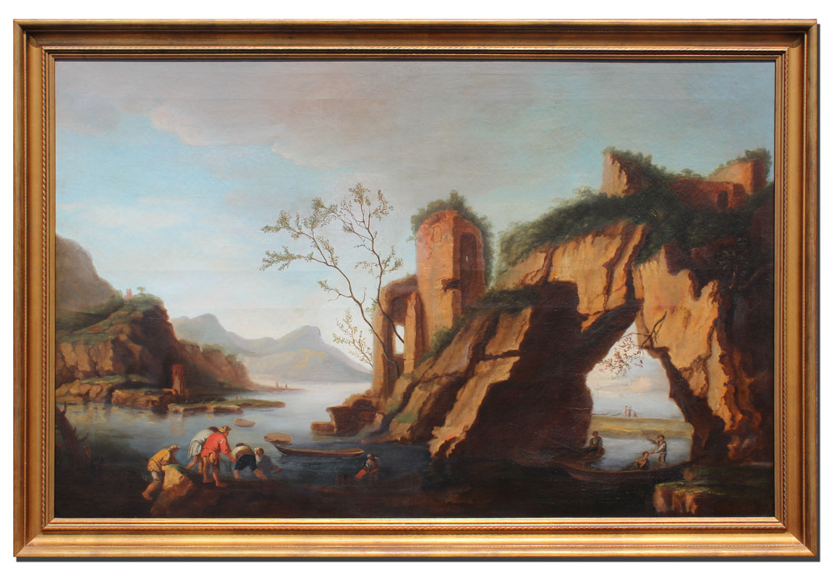 ITALIANATE HARBOR PAINTING WITH GROTTO AND FIGURES AFTER VERNET: OIL/Canvas, 34 3/4'' x 54'', no visible signature, older labels affixed verso, one with title Harbor Scene with Figures Vernate, newer frame, 39'' x 58 1/2''.