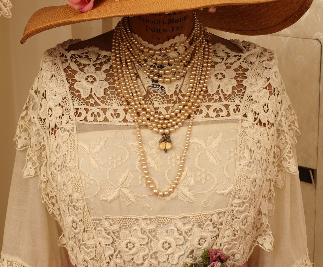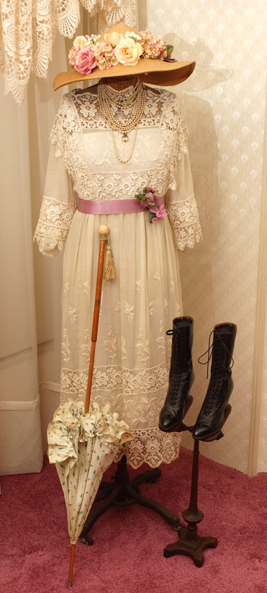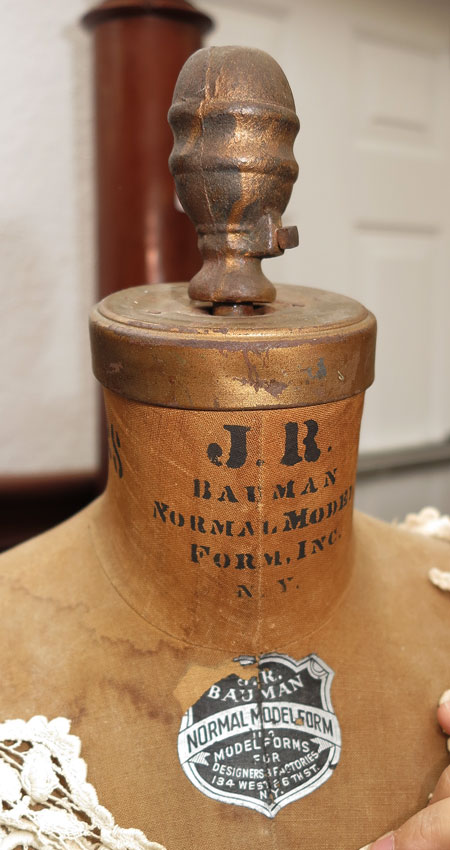 J. R. BAUMAN VINTAGE DRESS FORM WITH ACCESSORIES: Cast iron base with castors marked J. R. Bauman Normal Mode Form Inc., New York. Sold with a vintage dress, hat, shoes and parasol. Form measures 61 1/2'' h. x 18'' base dia.