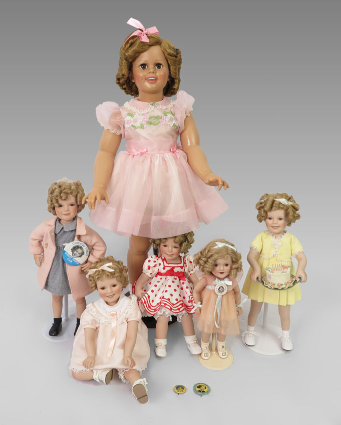 6 MODERN SHIRLEY TEMPLE DOLLS: 5 porcelain to include makers Susan Wareen and 2 Elke Hutchens. 1 large hard plastic measures 33'' h.. Sold with assorted added buttons and one with a cake.