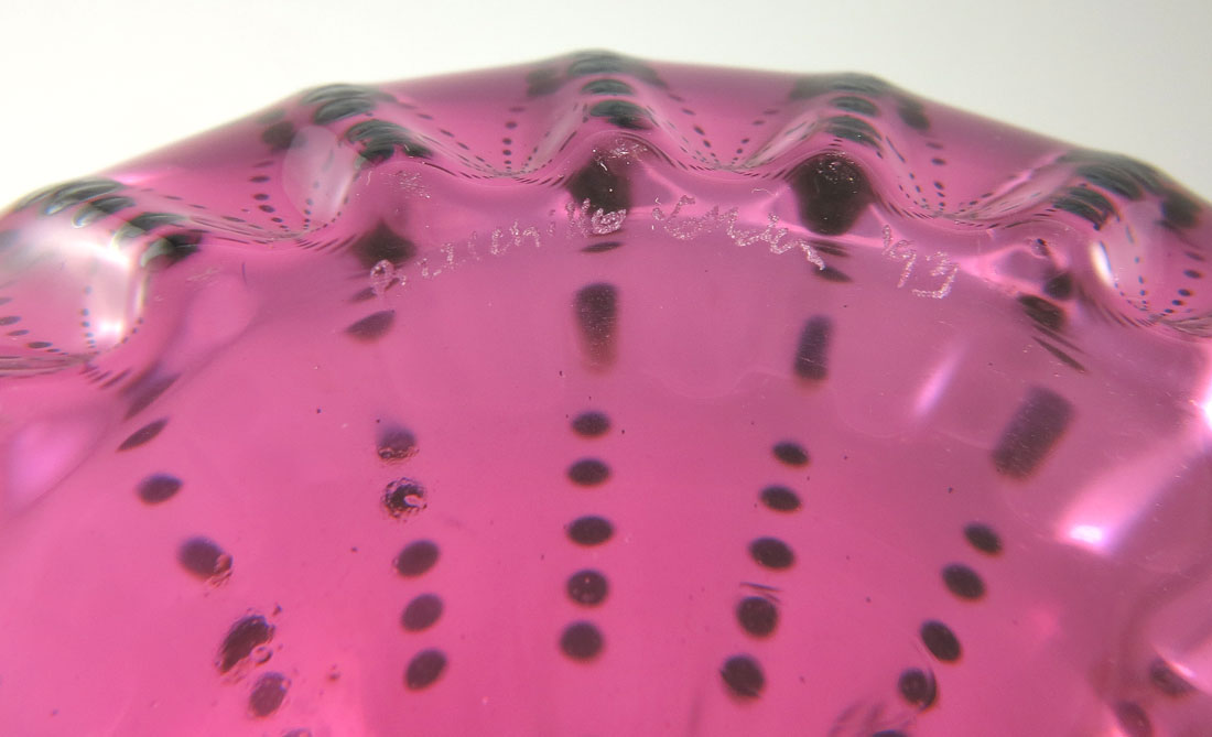PIZZICHELLO & GORDON BLOWN GLASS VASE: From their studio in Oakland California comes this blown glass with glass elements fused into the surface. Signed and dated '93. Approx. 16'' tall x 6'' dia.