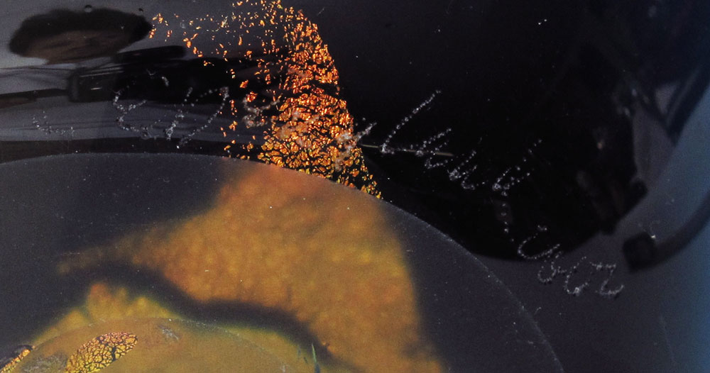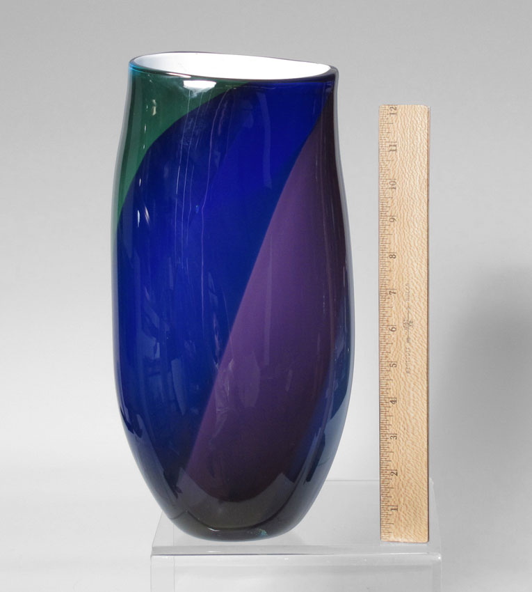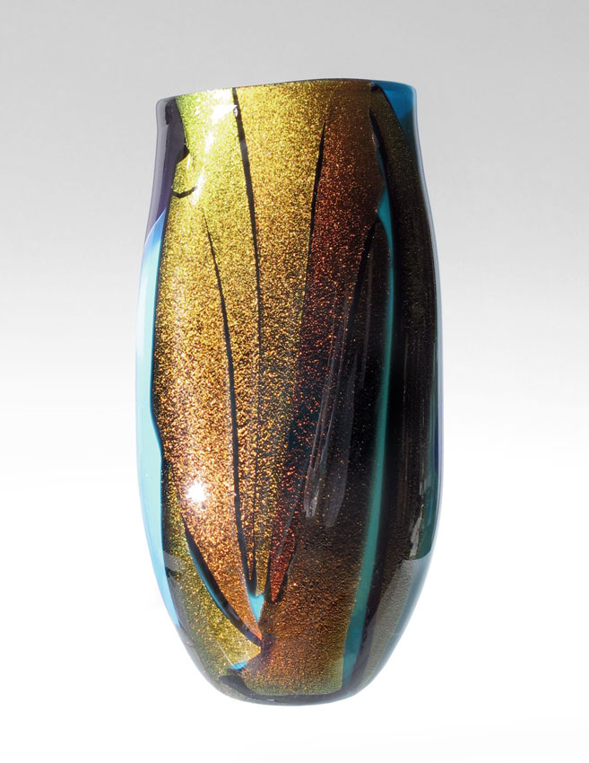 ILLEGIBLY SIGNED STUDIO ART GLASS VASE: In colors of the sea with a rich showing of metallic layered over white. Dated 2002. 13 1/4'' tall.