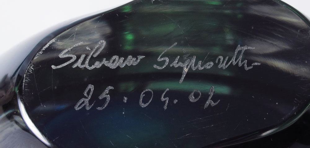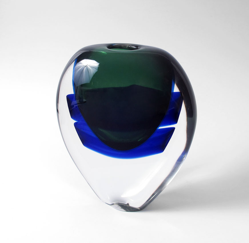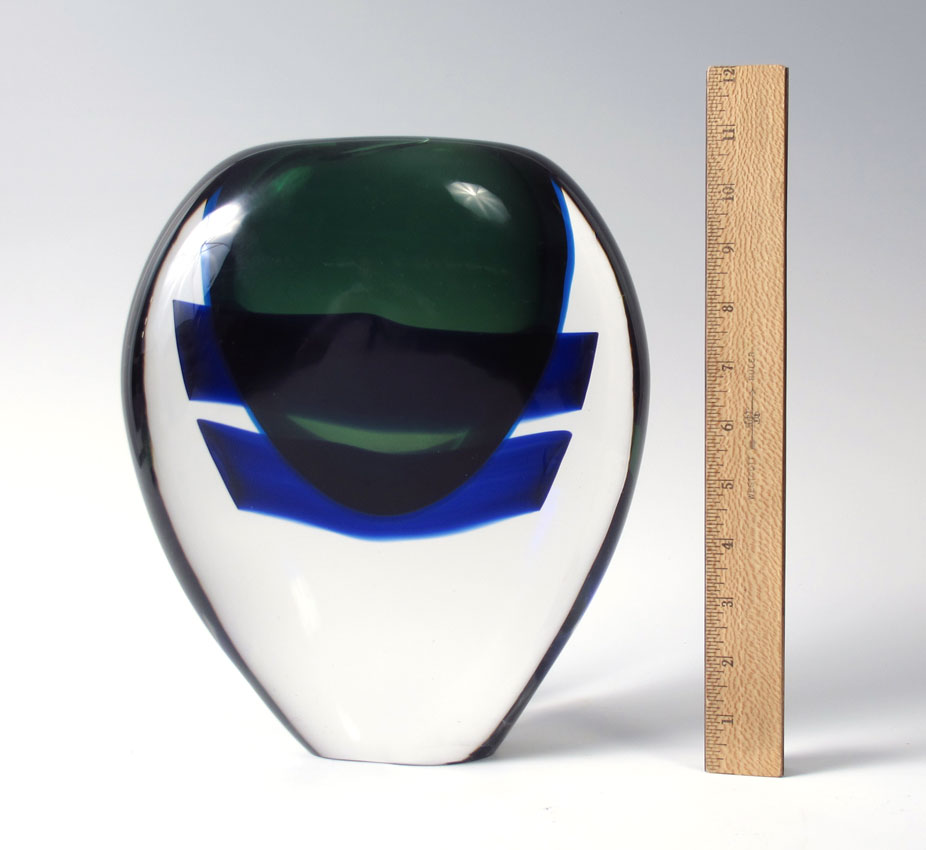 SIGNED SOMMERSO ART GLASS VASE: Blue and green sommerso technique in clear glass. Signature possibly Signoretti 25-09-02. Measures 10 3/4'' tall x 9'' wide. 18.5 lbs.