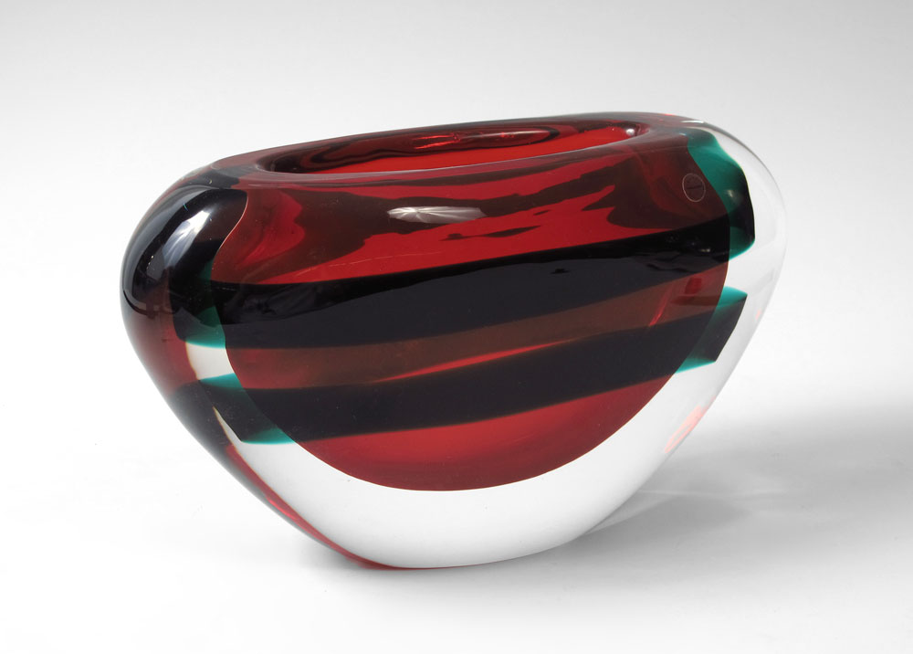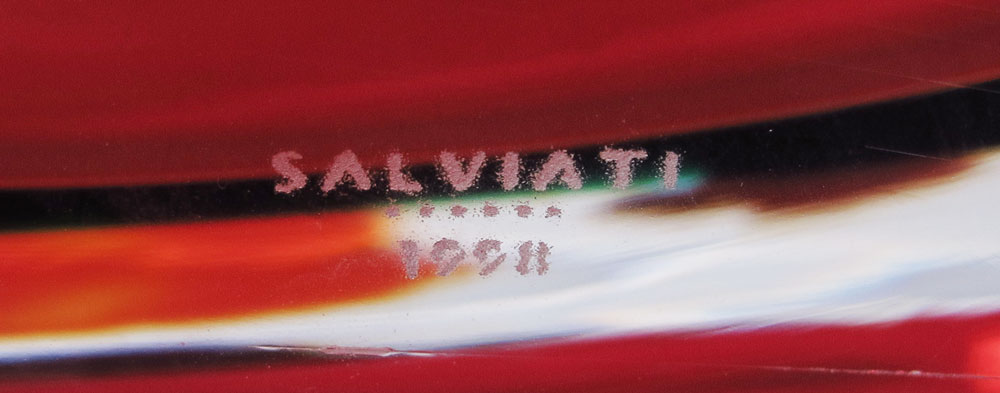 SALVIATI ART GLASS VASE: Sommerso with red and bands of teal. Venezia Made in Italy label and stamped Salviati 1998. 7 1/2'' h x 12''.