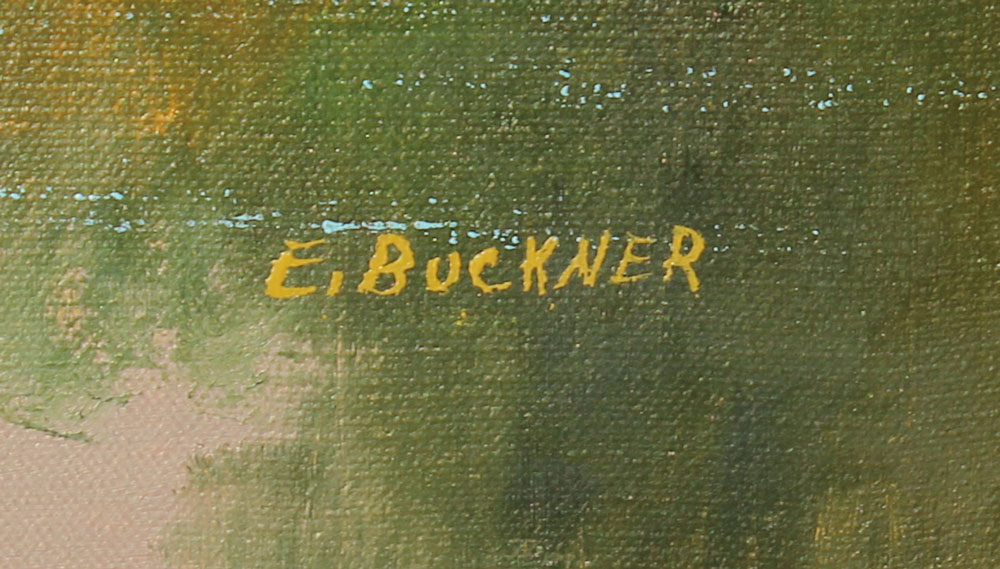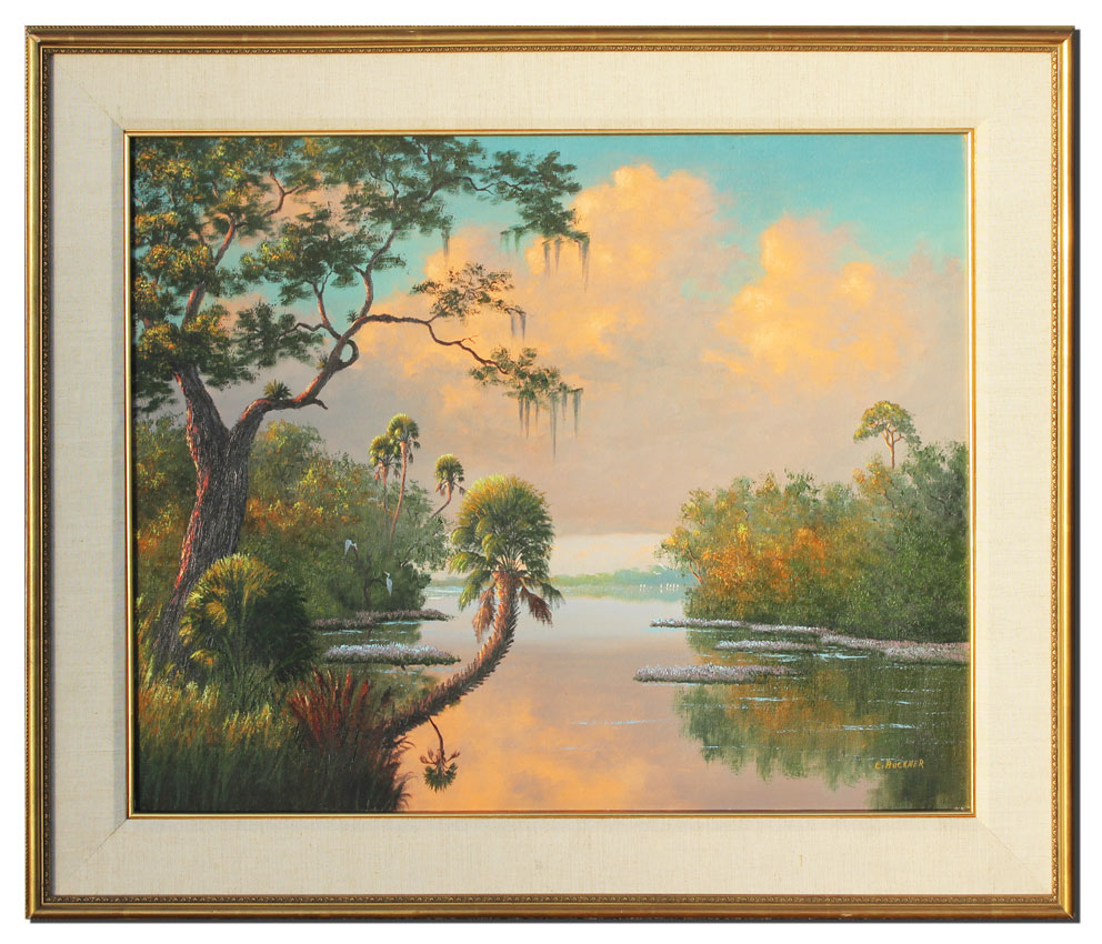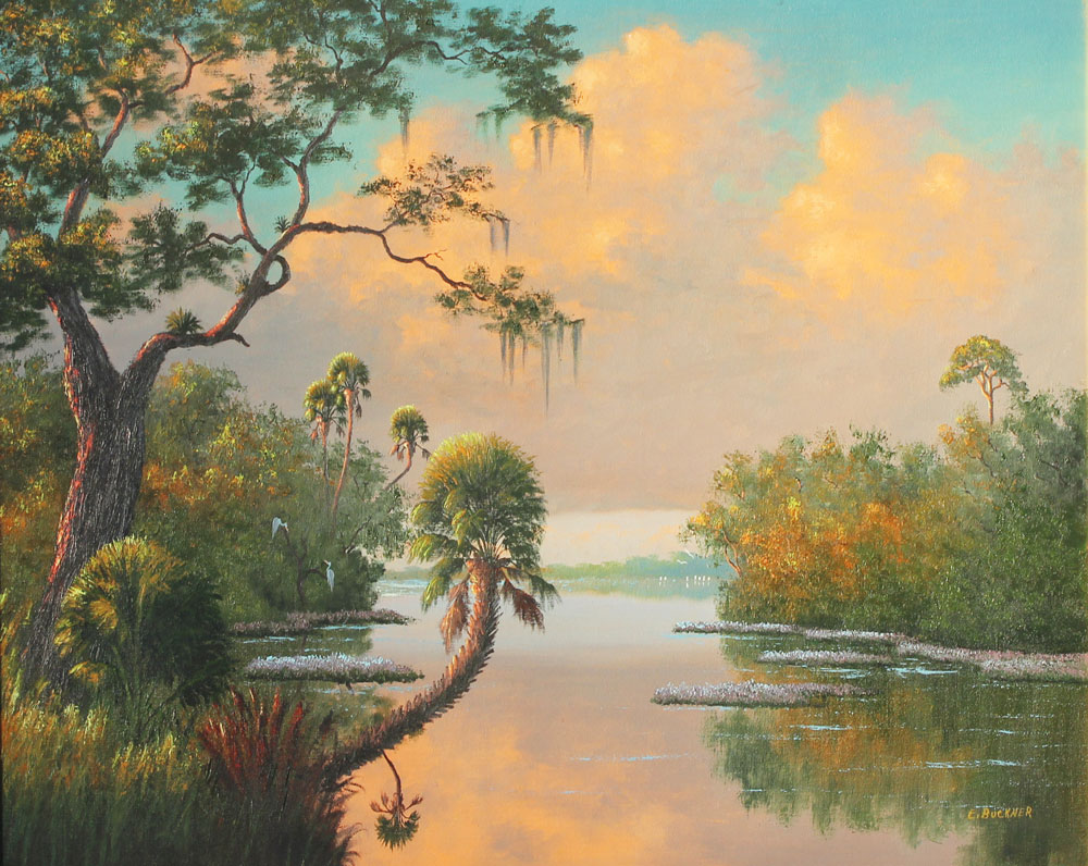 BUCKNER, Ellis, (American, 20th Century): Peaceful River Landscape with Egrets and Sunlit Clouds, Oil/Canvas, 24'' x 30'', signed lower right, gilded frame with fabric mat, 32'' x 37''.