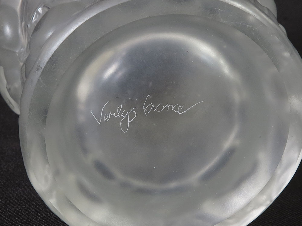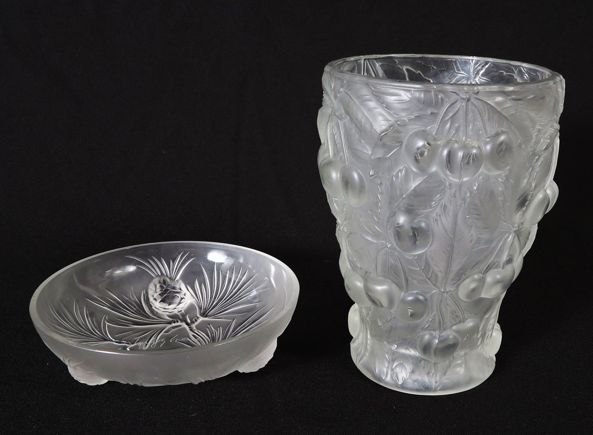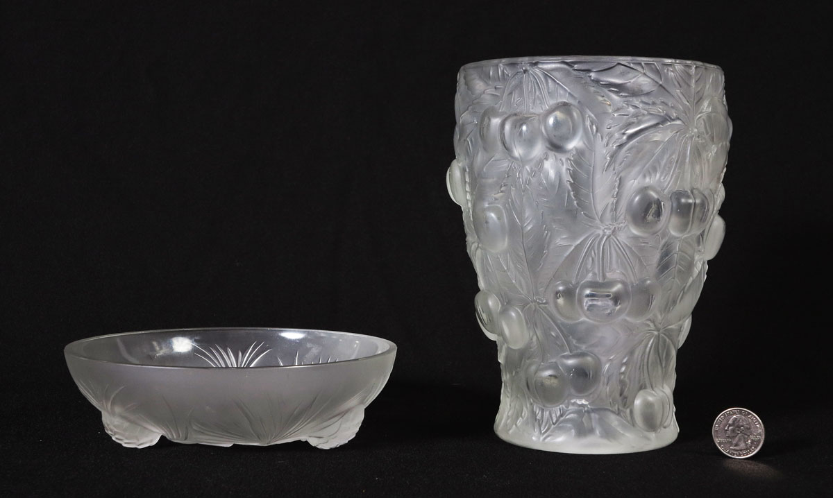 LOT OF TWO FRENCH VERLEYS ACIDE ETCHED PIECES: A 7.5'' flared top vase in the Cherries pattern and a 6'' wide, tri-footed table bowl in the Pine Tree pattern, both signed.
