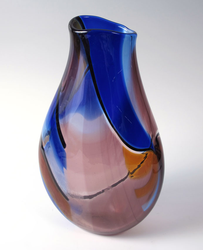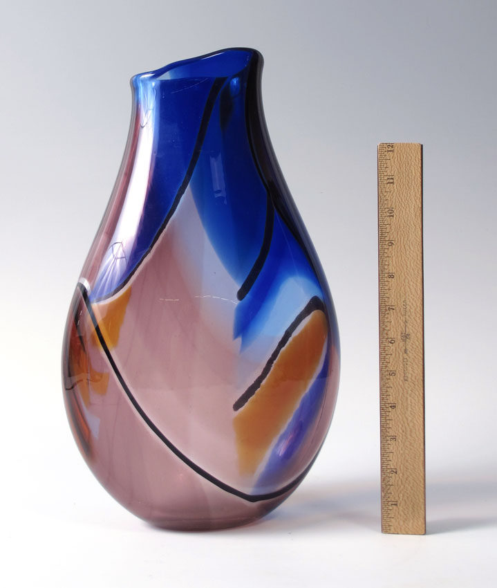 ILLEGIBLY SIGNED ART GLASS VASE: Shades of blue, illegibly signed Alvo ******** dated 2007. Approx. 15'' tall.