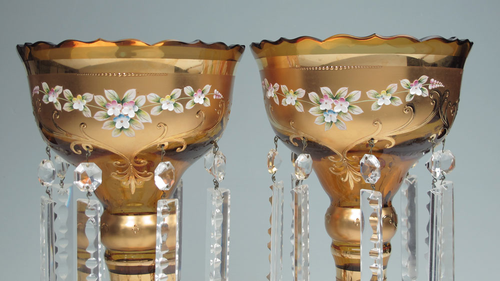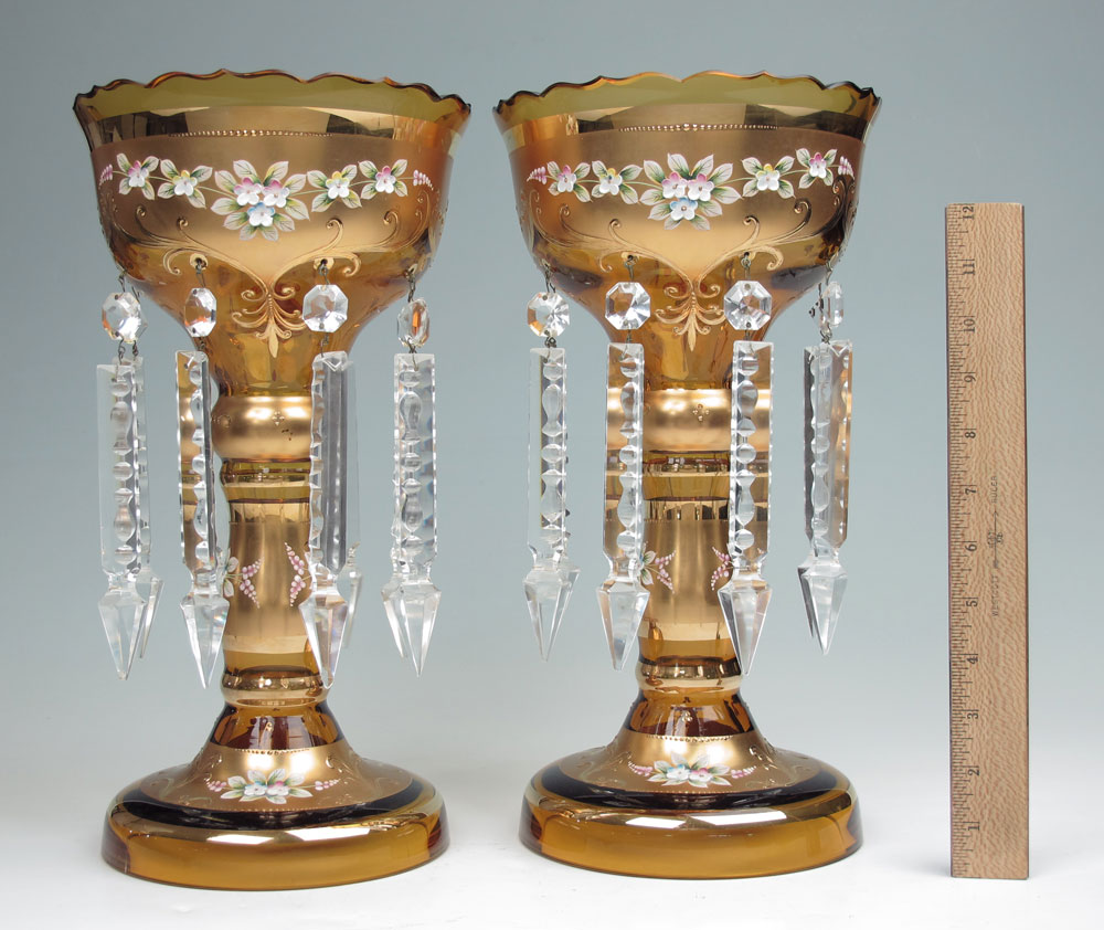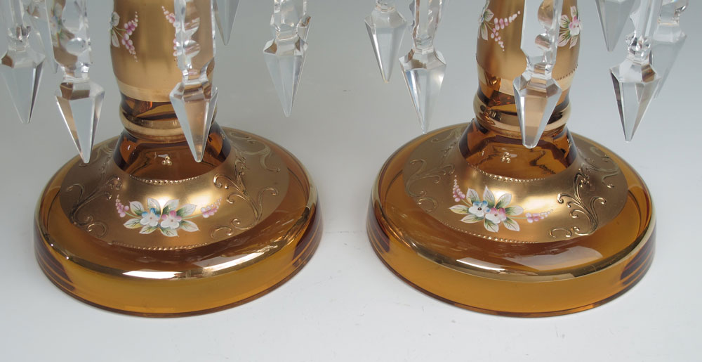 ENAMELED AMBER GLASS LUSTERS: Parcel gilt amber glass with heavy enameled floral decoration. Cut crystal prisms. Measures 12 1/2'' tall, 7 3/4'' dia.