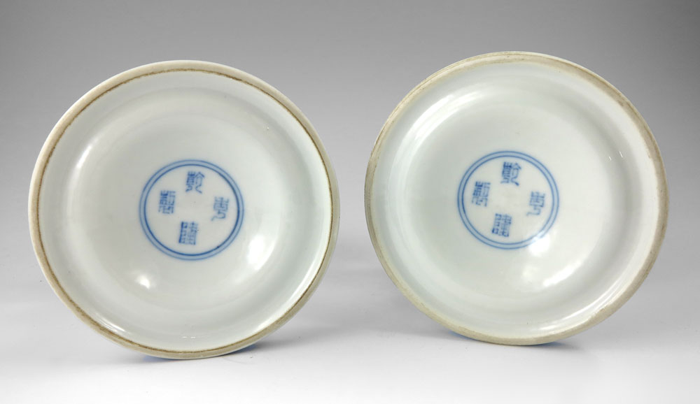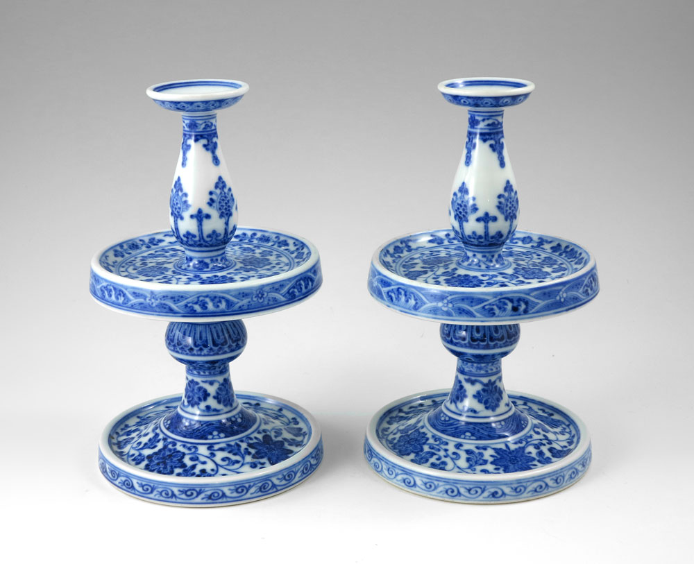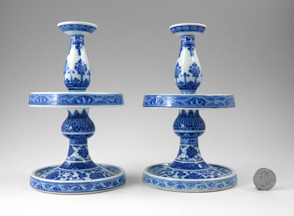 PAIR CHINESE BLUE AND WHITE PORCELAIN CANDLE STANDS: 7 1/2'' tall, 4 1/4'' at the widest.