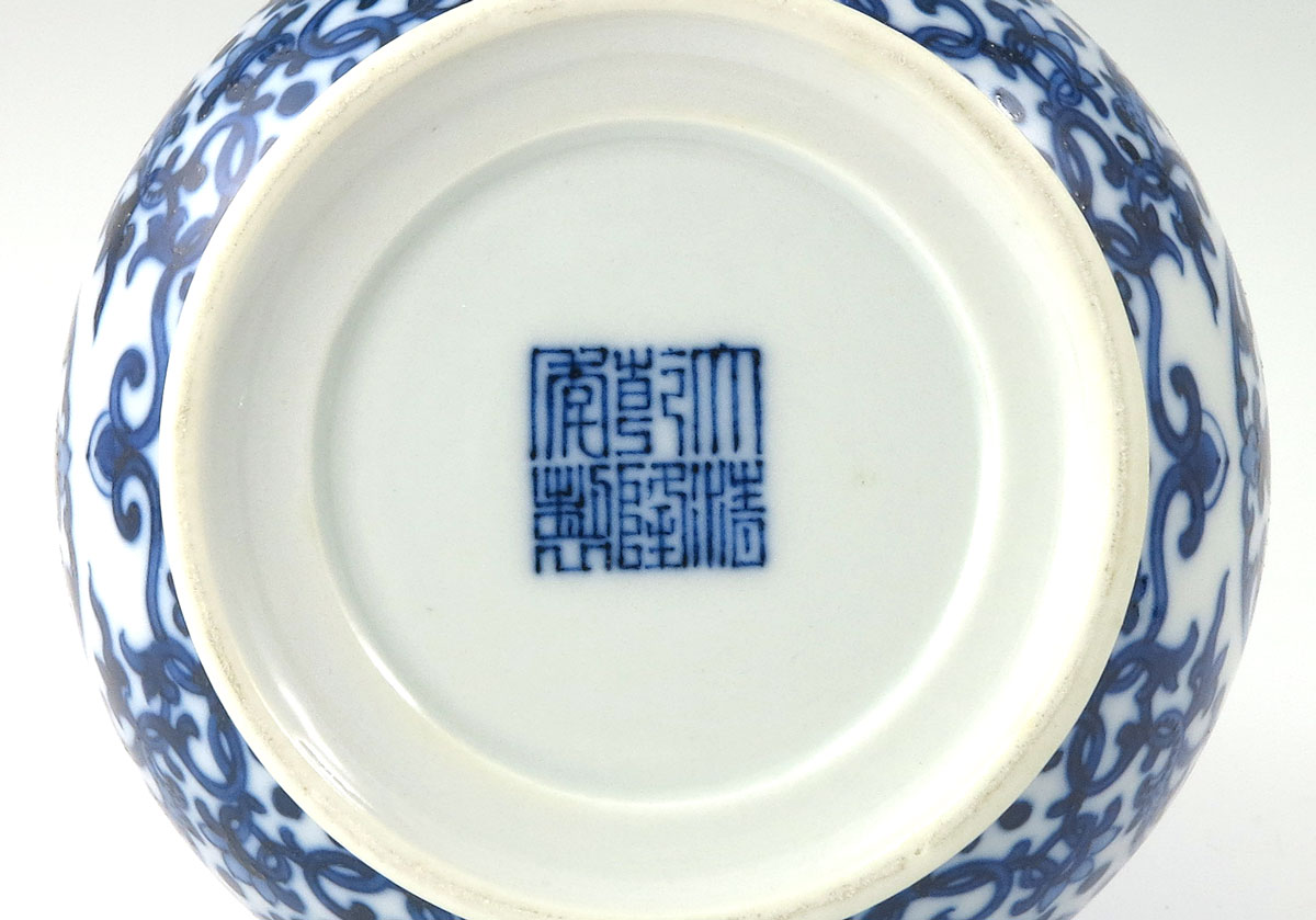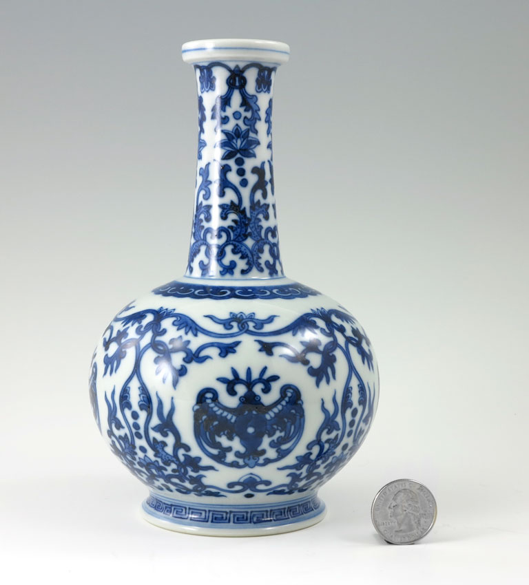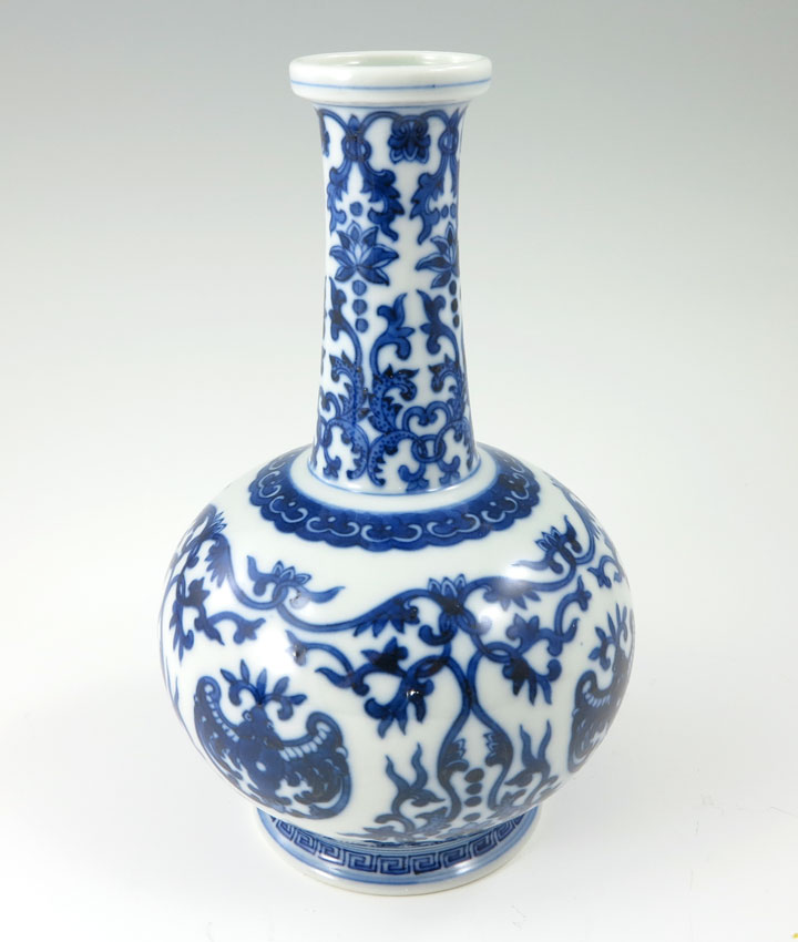 CHINESE BLUE AND WHITE BOTTLE VASE: 7 1/2'' tall x 4 1/2'' at the widest.