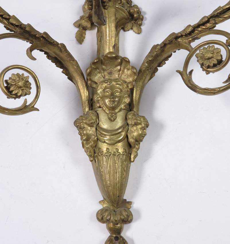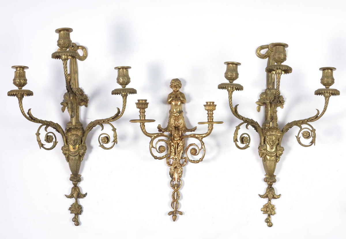 3 PIECE GILT METAL CANDLE SCONCES: To include matched pair foliate decorated 3 light sconces with center masquerons of women. 21 1/2'' x 13 3/4'' x 9''. Sold with a single 2 light with cherub playing flutes and foliate decoration. 16 1/2'' x 10 1/2'' x 4 3/4''.