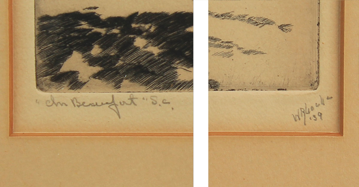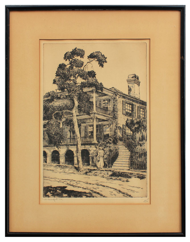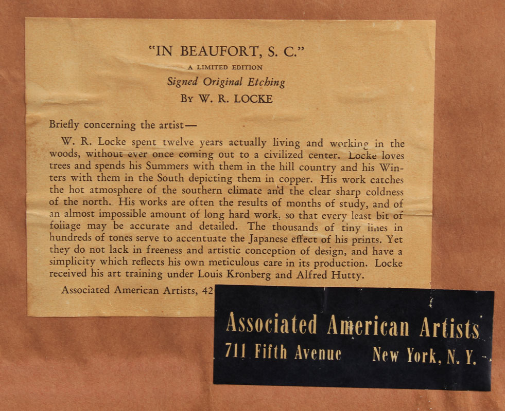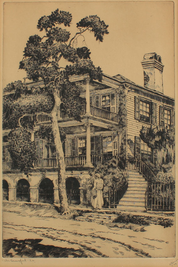 Locke, Walter Ronald, (American 1883 - ?): ''In Beaufort, S.C.'', Limited Edition Original Etching, sight size, 13'' x 8 3/4'', pencil signed lower right, dated '39, titled lower left, original AAA Label affixed verso, encased in ordinal black frame with wear, 18 1/2'' x 14 1/2'', the scene depicts a young African American woman walking in front of an old plantation.