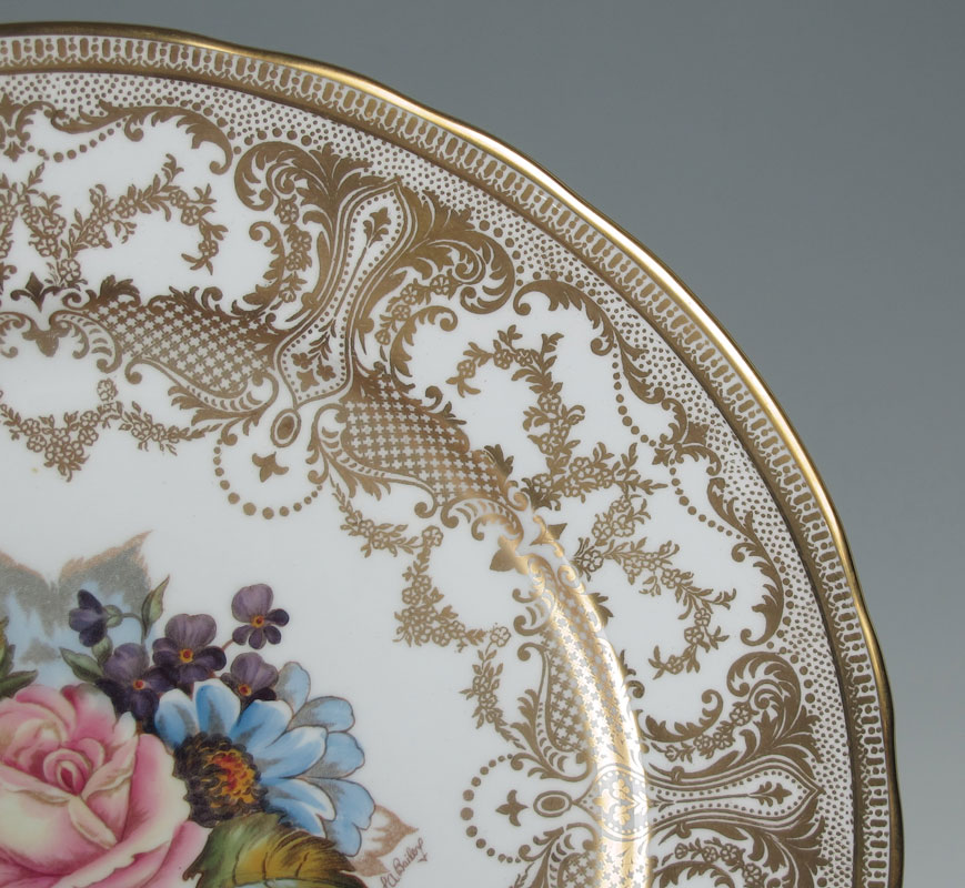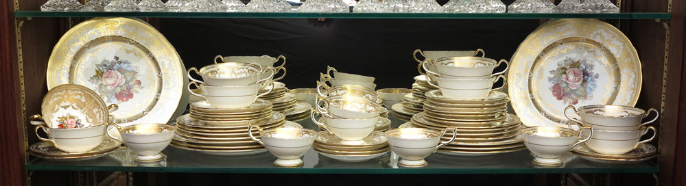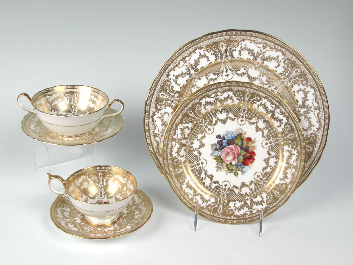 AYNSLEY BONE CHINA SERVICE FOR 8 SIGNED JA BAILEY: 56 pieces to include 8 Dinner Plates, 8 Salad Plates (8 1/4''), 8 Bread, 8 Cream Soup, 8 Underplates, 8 Tea Cups, and 8 Saucers.