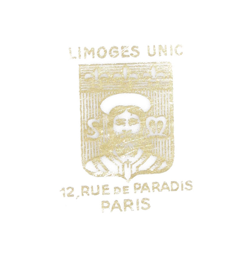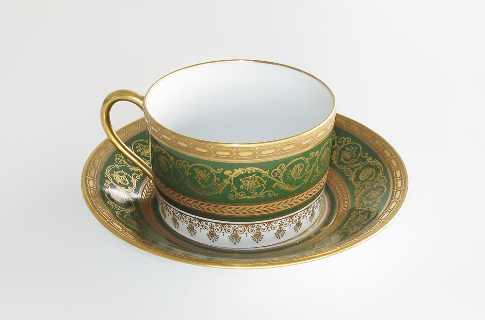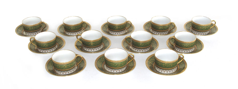 FRENCH LIMOGES CUPS & SAUCERS: Limoges Unic, 12 Rue de Paradis, Paris. Set of 12 green and gold fine china cups and saucers.