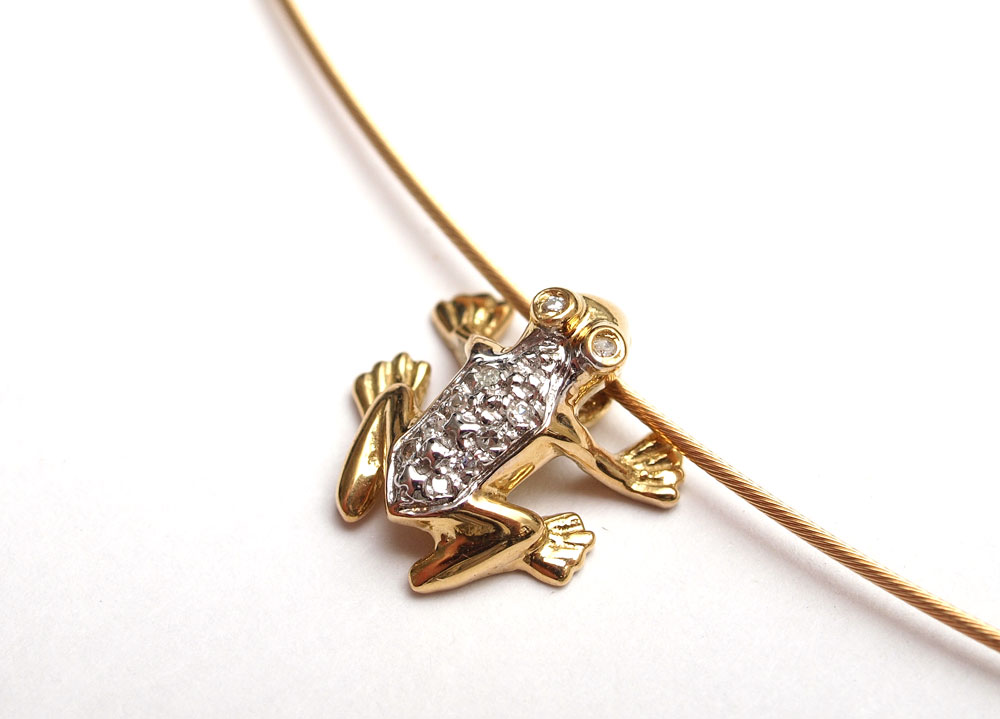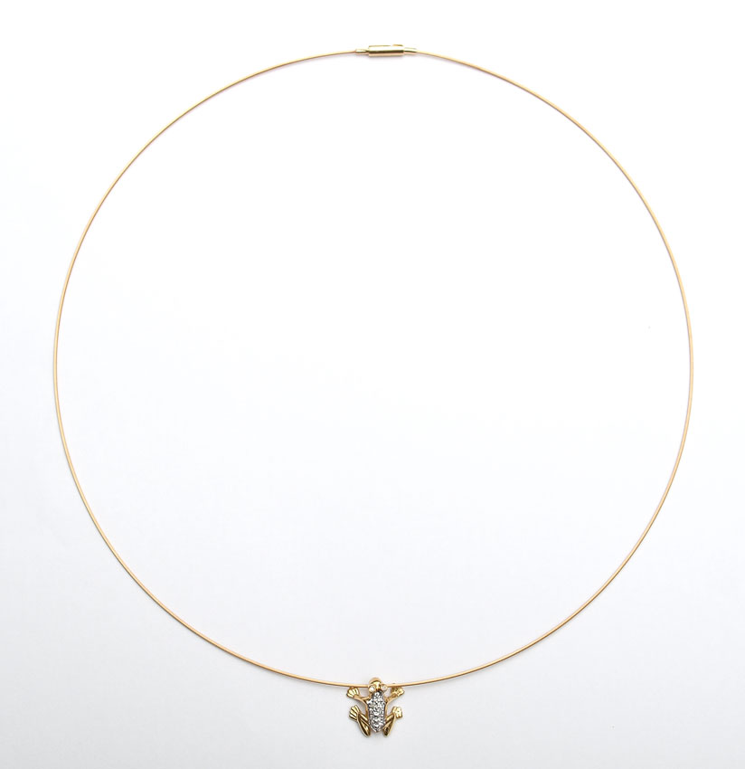 18K CABLE NECKLACE WITH FROG PENDANT: 18K yellow gold 16'' cable necklace with frog charm containing 10 round single cut diamonds. Weight: .05 Ct. Approx. VS in clarity and G-H in color. Weight: 4.3 grams.