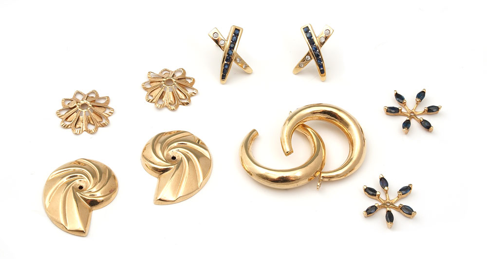 LOT OF 14K EARRINGS AND JACKETS: One pair of earrings and 4 pairs of jackets with diamonds and natural sapphires. The earrings do not have backs. Weight: 9.7 grams.