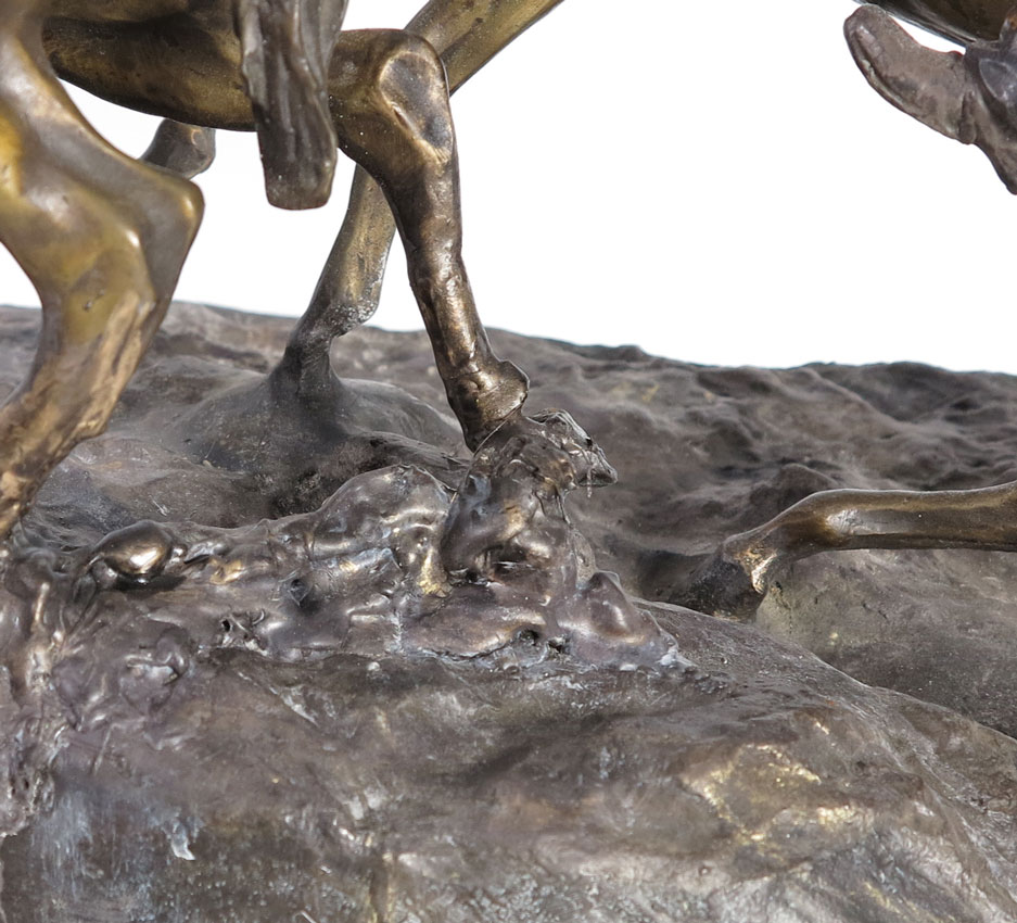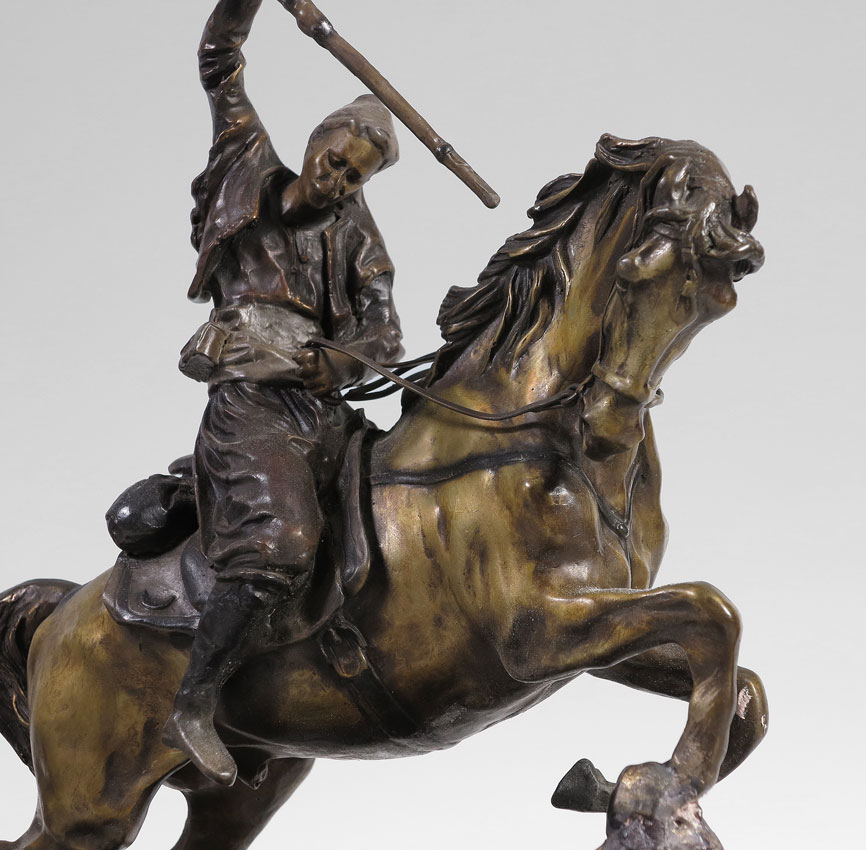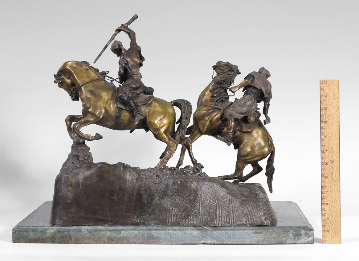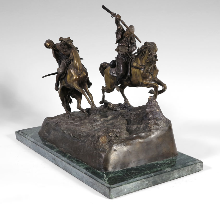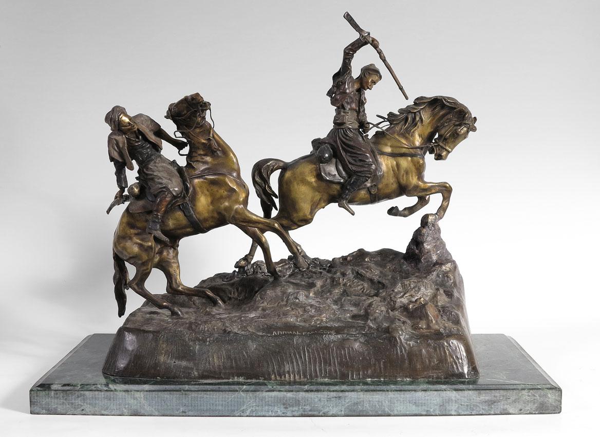 BRONZE GROUPING OF COSSACK SOLDIERS ON HORSEBACK AFTER LANSERE: 16 1/2''h x 16 1/2'' x 9 1/2'', affixed to beveled green marble plinth, 18''h x 22 1/4'' x 12'' overall, incised signature, circa 1950.