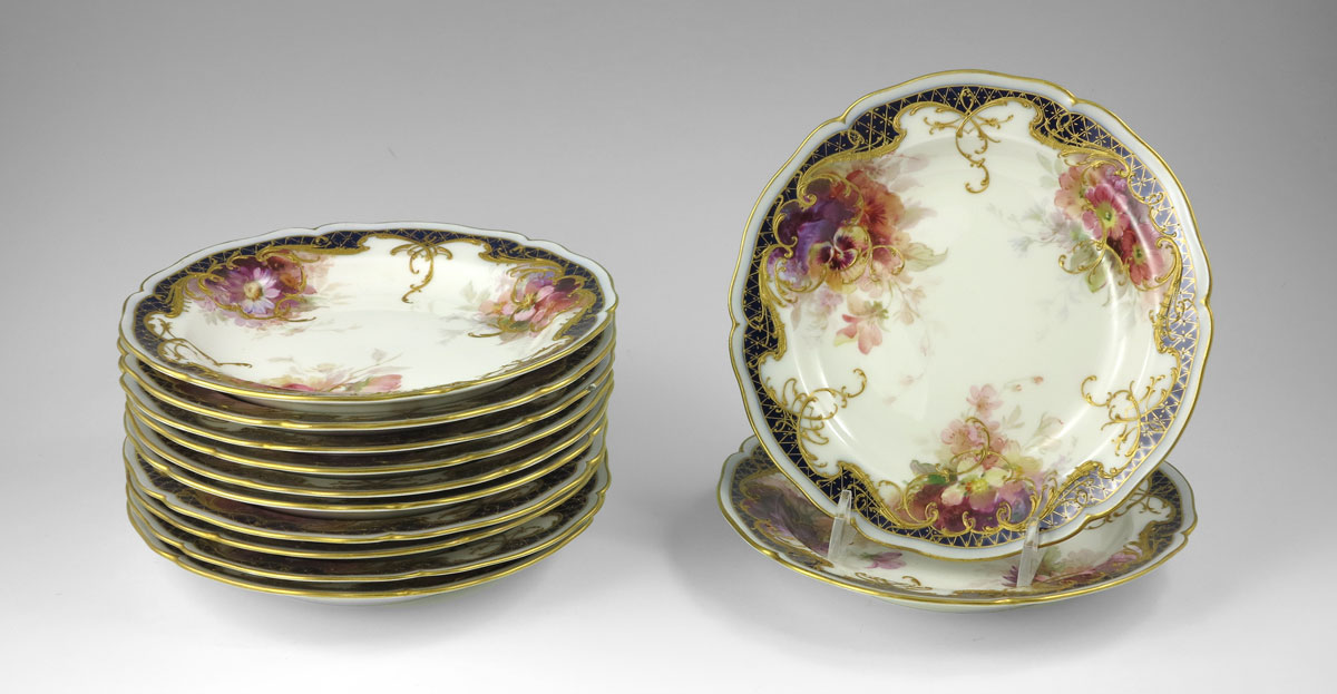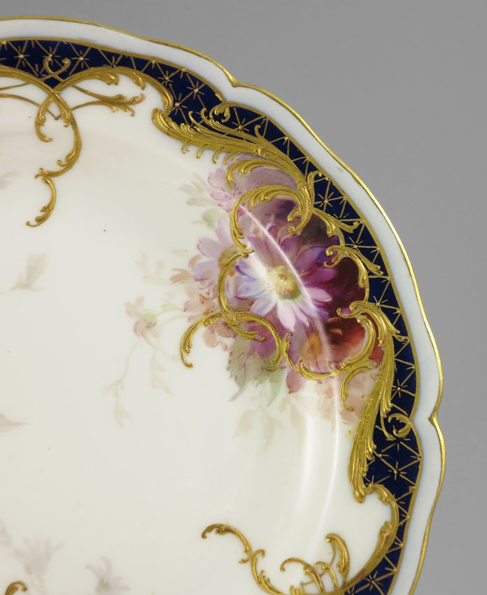 SET OF 12 KPM HAND PAINTED PLATES: Berlin Porcelain Manufactory. Blue scepter and red imperial orb mark. Hand painted flower design with raised gold scroll decoration. 6 3/4'' dia.
