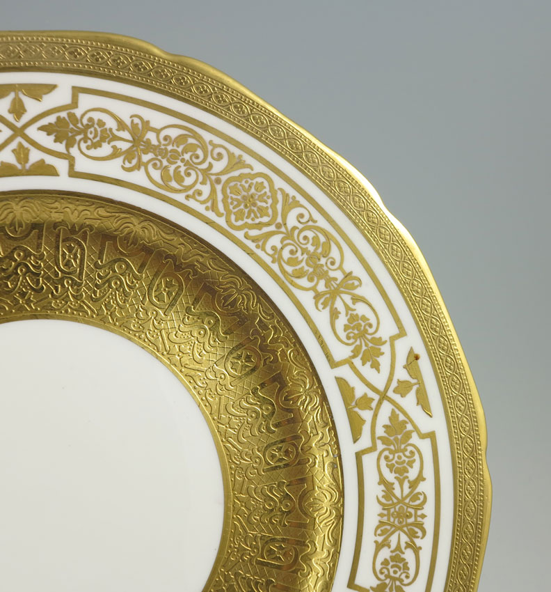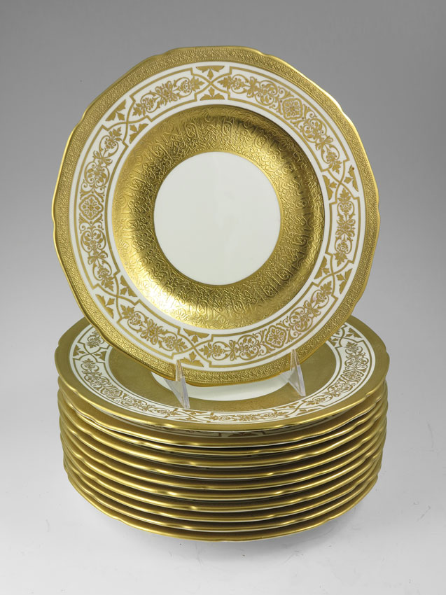 SET OF 12 EMBOSSED GOLD RIM FINE CHINA SERVICE PLATES: Triple gold border, 10 1/2'' dia.