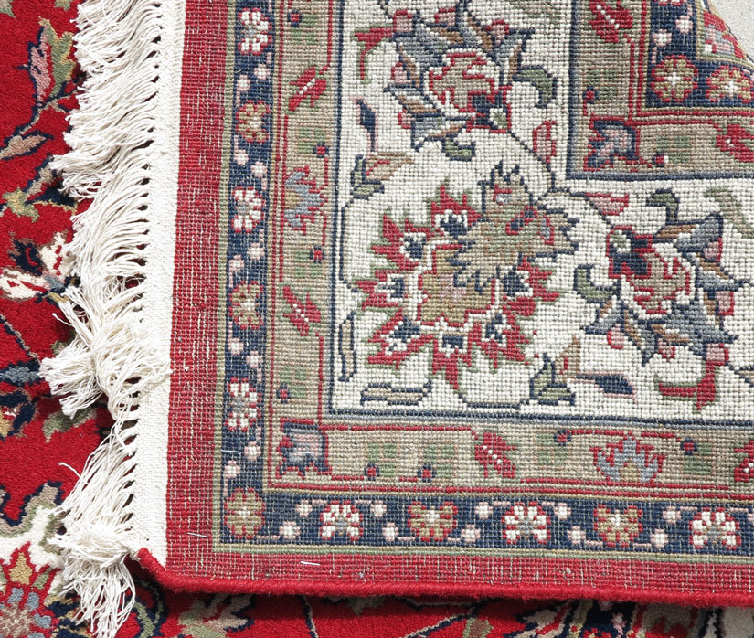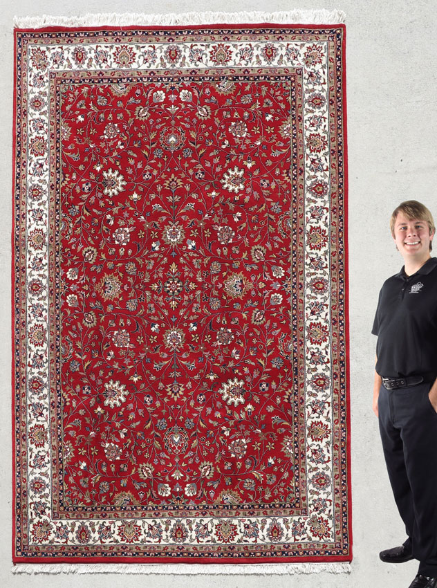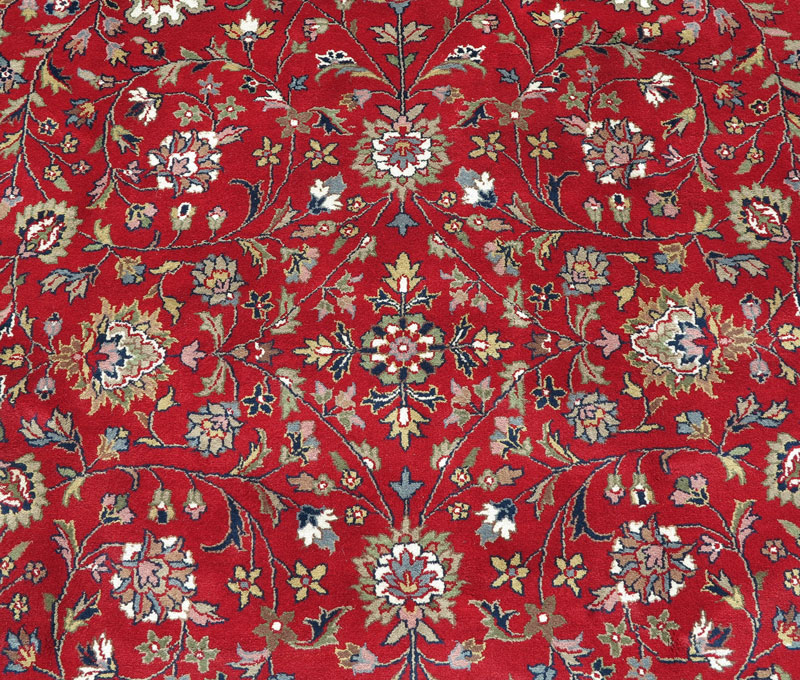 MODERN INDO-PERSIAN KASHAN HAND KNOTTED WOOL RUG, 6'7'' x 9' 10'': The vibrant red field with a traditional Kashan design that includes small flowers, vines, and leaves that cover the field, is mostly in tones of soft blue, green, and beige. The white in the design motifs of the field and the white ground main border really stand out and make this rug pop! This rug would look good in any setting. Condition is good.