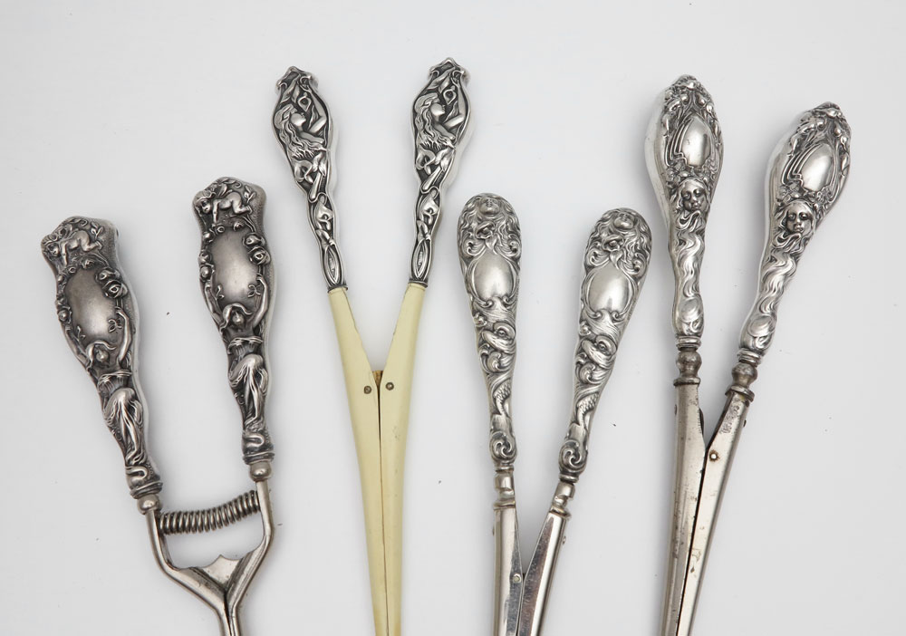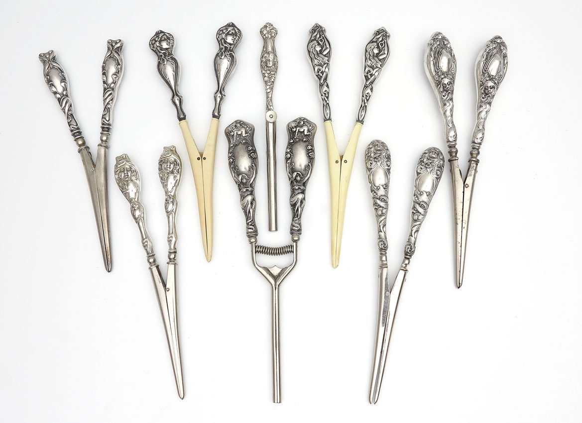 COLLECTION ART NOUVEAU STERLING GLOVE STRETCHERS: 8 piece to include 1) Cupid facing down to woman, marked Sterling. 2) Woman's face looking right, ivorine tines, marked Sterling. 3) Woman's face mid-handle, single handle, marked Sterling. 4) Woman's face frontal, marked Sterling. 5) Art nouveau swirls, marked Sterling, attrib. to Kerr. 6) Woman's face atop looking forward, with swirled hair, sea creature below, marked Sterling. 7) Left profile of woman's bust with raised arm, marked Sterling. 8) Unger Brothers ''Evangeline'' woman's frontal face downward looking. Some monogrammed, longest measures 9''.
