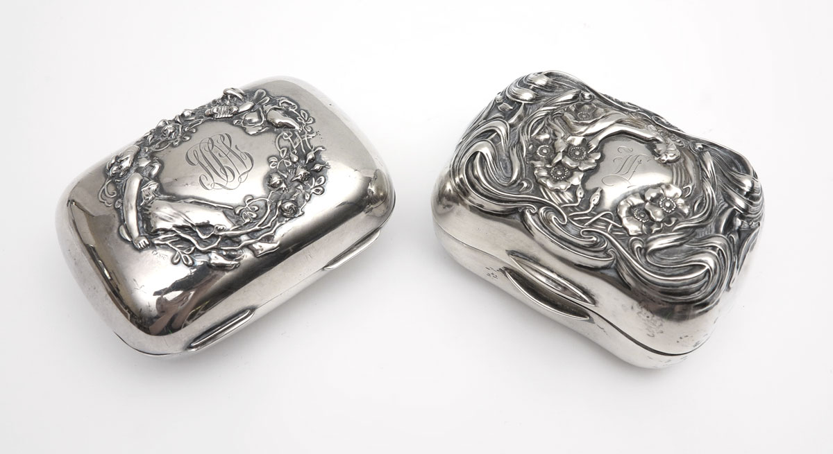 2 PIECE ART NOUVEAU STERLING SOAP BOXES: To include 1) Kerr woman and cherub. 2) Unger Brothers ''Reine des Fleurs'' pattern, 1 3/4'' x 3 1/2'' x 2 3/4''. Both monogrammed, Approx. 6.0 troy oz.