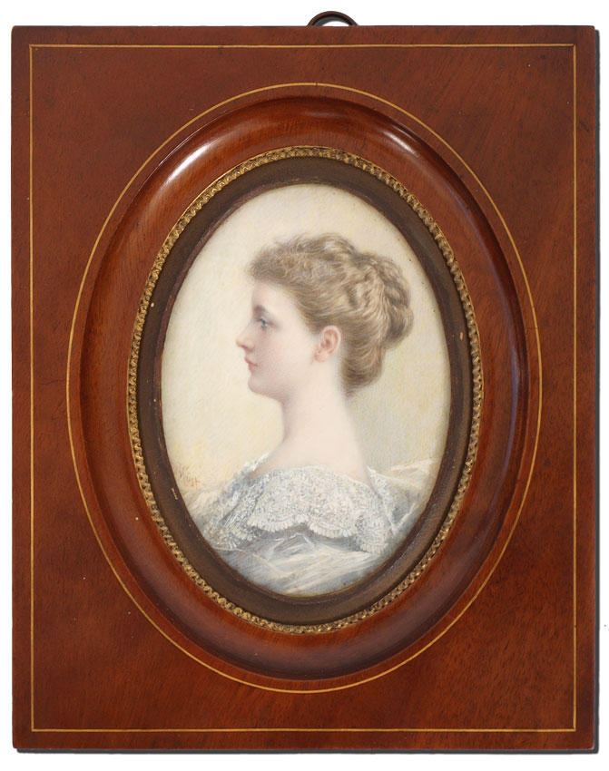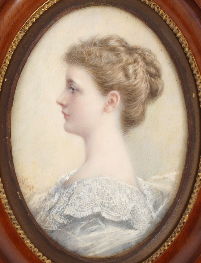WUST, Theador, (American, 19th Century): Portrait of a Young Maiden, Watercolor/Ivory, 4 3/4'' x 3 1/2'', signed lower left, encased in period string inlaid wood molding, 8'' x 6 3/8''. Age appropriate wear, no apparent condition issues.
