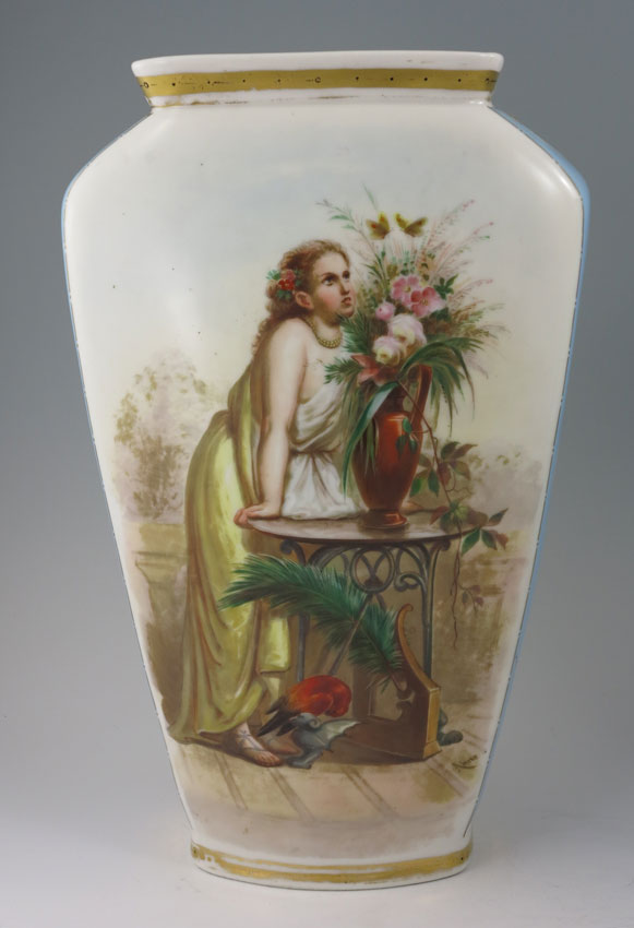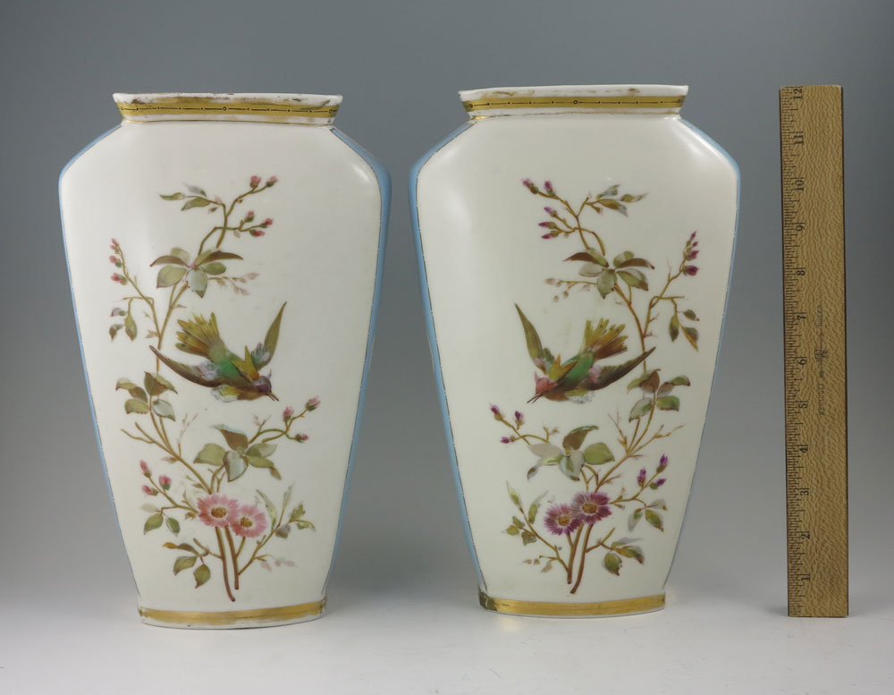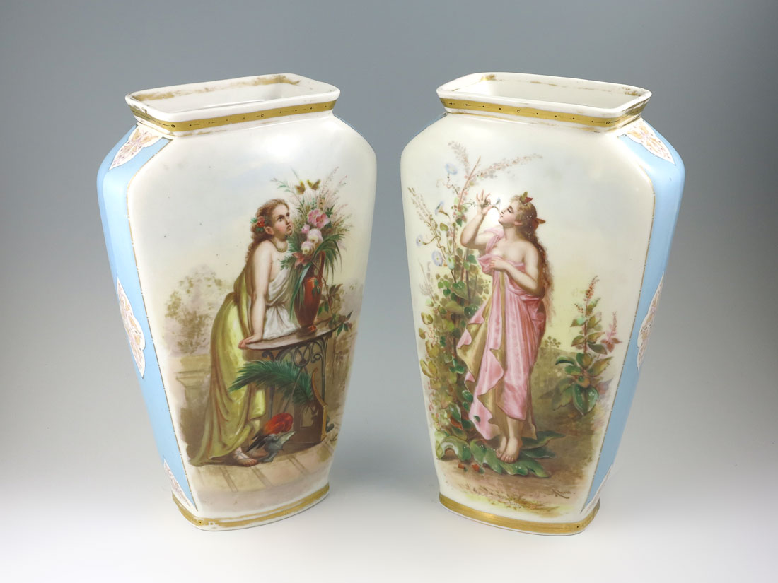 PAIR SIGNED AHNE PORCELAIN VASES: Hand painted with scenes of women in outdoor settings on one side, birds on the other, each signed Ahne for Josef Ahne. Impressed mark 102 on base. 12'' h. x 7 1/2'' x 3 3/4''.