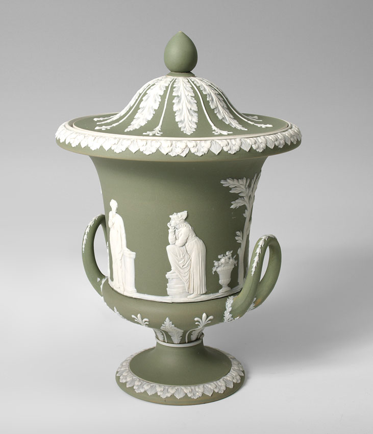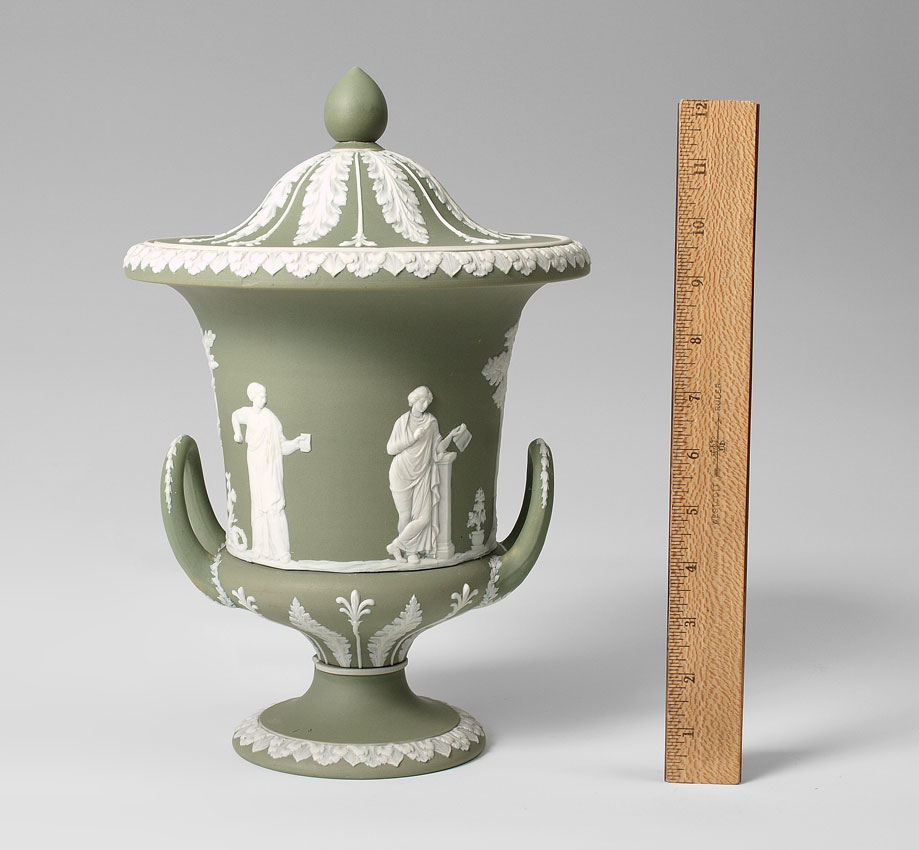 WEDGWOOD JASPERWARE COVERED URN: Ca. 1891-1921. Green with white classic figures, impressed ''Wedgwood'' and ''England''. 12 1/2'' tall x 8 1/2'' dia.