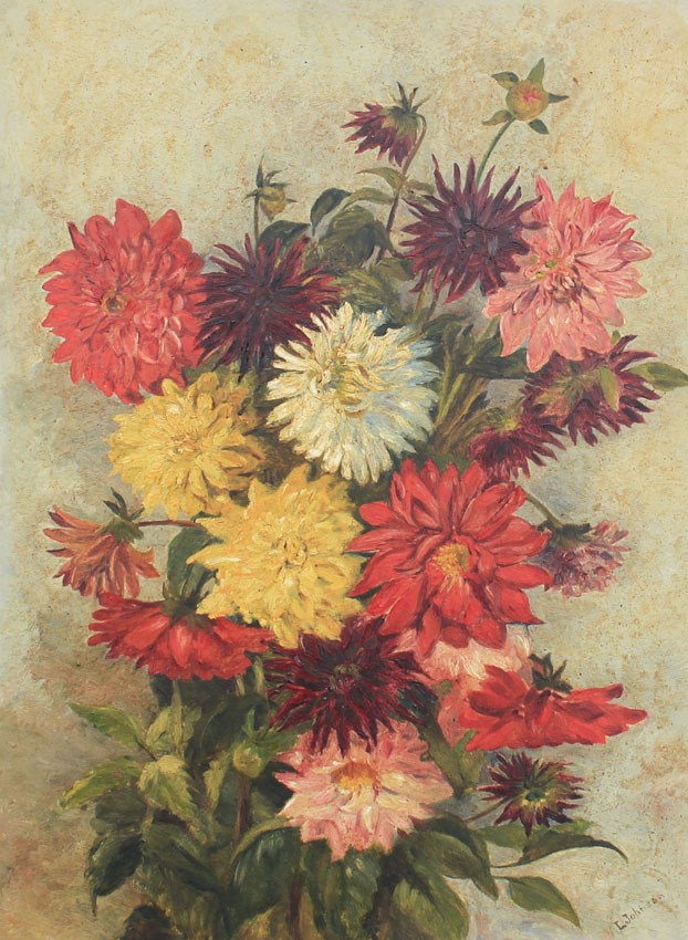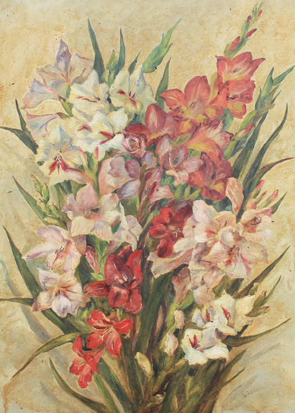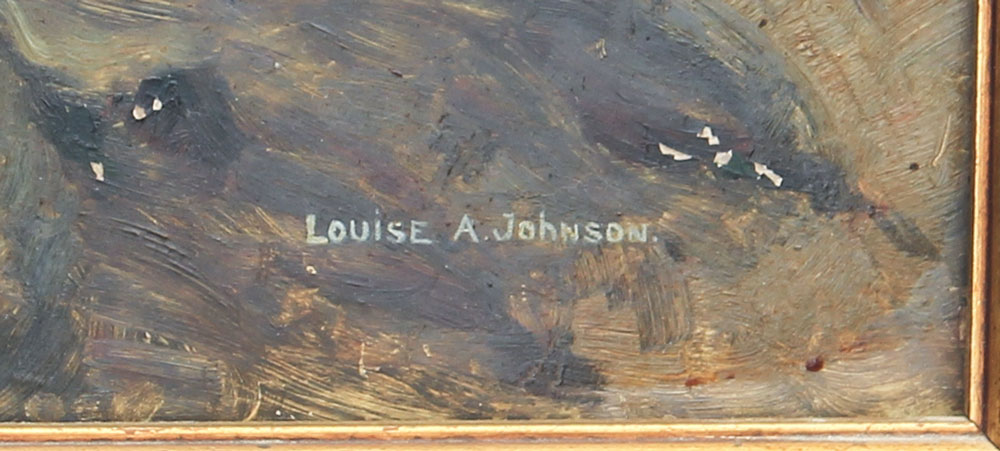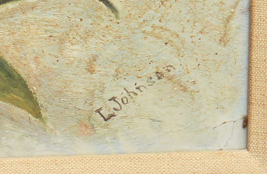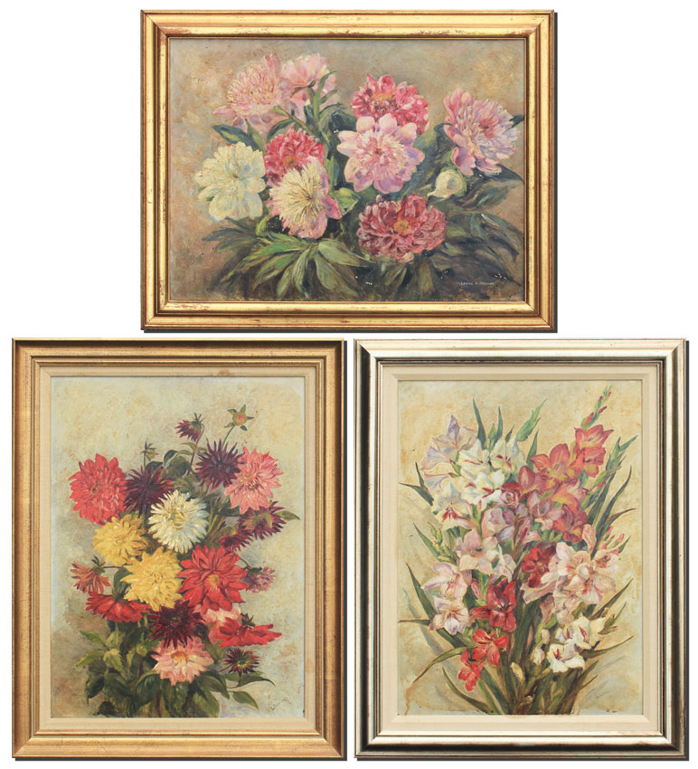 JOHNSON, Louise, (American, 20th Century): 3 Floral Still Lifes; 1) Oil/Board, signed lower right, sight size, 23 1/2'' x 16 1/2'', framed 29 1/2'' x 23'', will require cleaning. 2) sight size, 17 3/4'' x 23 1/2'' signed lower right, gilded frame with wear, 22'' x 27 1/2''. 3) sight size, 23 1/2'' x 17 1/2'', signed lower right, painted frame, 29'' x 23''.