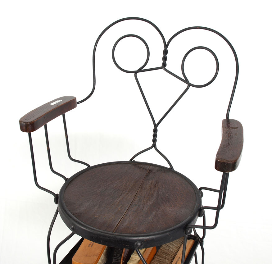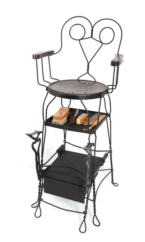 WROUGHT IRON SHOE SHINE STOOL/STAND: Twisted wrought iron frame with two foot stands, lower drawer for holding shoe shine equipment, wood seat and arms, measures, 53'' h. x 16 3/4'' x 30''.
