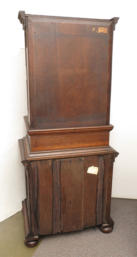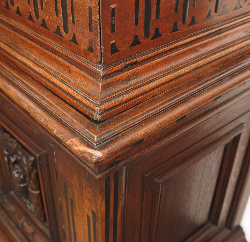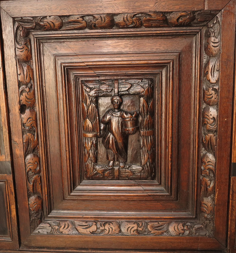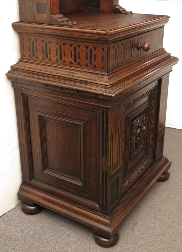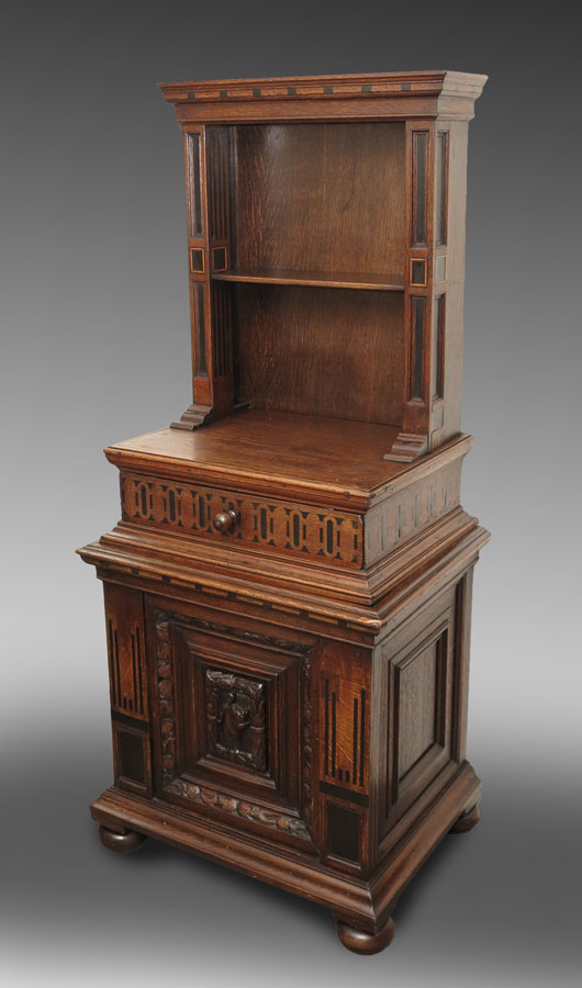 CONTINENTAL CARVED OAK SIDE BOOKCASE CABINET: In 2 sections, top section with stepped crest over single shelf, carved side columns, over single drawer with applied decoration. Lower section with carved panel door and applied decoration, all on bun feet. Measures 67'' h. x 29 1/2'' x 22 1/2''.