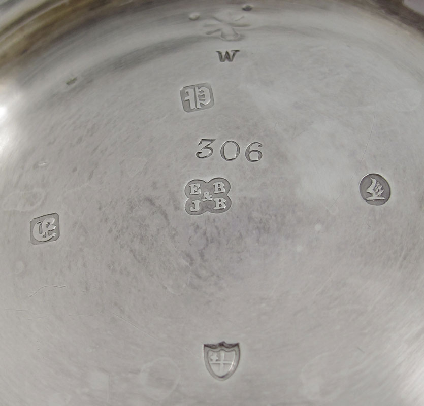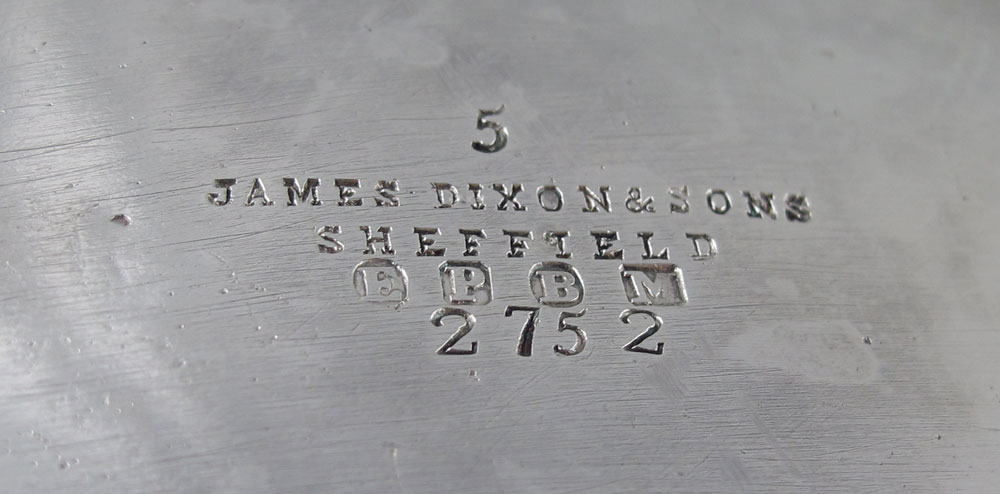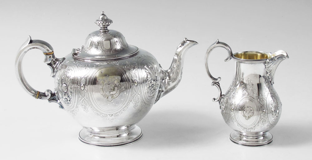 BARNARD & DIXON ENGLISH SILVERPLATE TEA SET: A 5 piece assembled set to include from James Dixon & Sons 1) Teapot with hinged lid, engraved, 6'' h. x 10 3/4''. 2) Open sugar, engraved, 5 1/2'' x 7 1/2''. 3) Open creamer, engraved, 5 3/4'' h. x 4 5/8''. From Edward & James Barnard to include 4) Teapot with hinged lid, engraved and monogrammed, 7 1/4'' x 10 1/2''. 5) Open creamer, engraved and monogrammed, vermeil interior, 5 5/8'' x 4 7/8''.