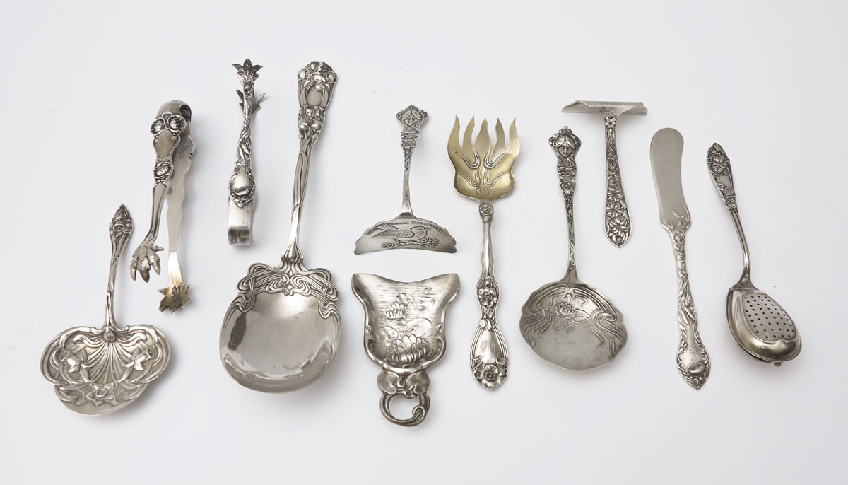 COLLECTION ART NOUVEAU STERLING TABLEWARE: 11 pieces to include 1) Paye & Baker tea brewer teaspoon. 2) Blackington Butter spreader. 3) Attrib. Paye & Baker ''Who Killed Cock Robin'' baby food pusher. 4) Whiting baby food pusher. 5) Bon Bon server with woman's head atop, illegible mark. 6) Gorham Bon Bon server. 7) Unger Brothers tea caddy spoon with water lilies. 8) Unger Brothers sardine fork ''La Fleurette'' pattern. 9) Durgin retailed by Shreve, Crump & Lowe serving spoon, 7 3/4'' long. 10) Blackington floral sugar tongs. 11) Shiebler floral sugar tongs. Some pieces monogrammed. 8.1 troy oz.