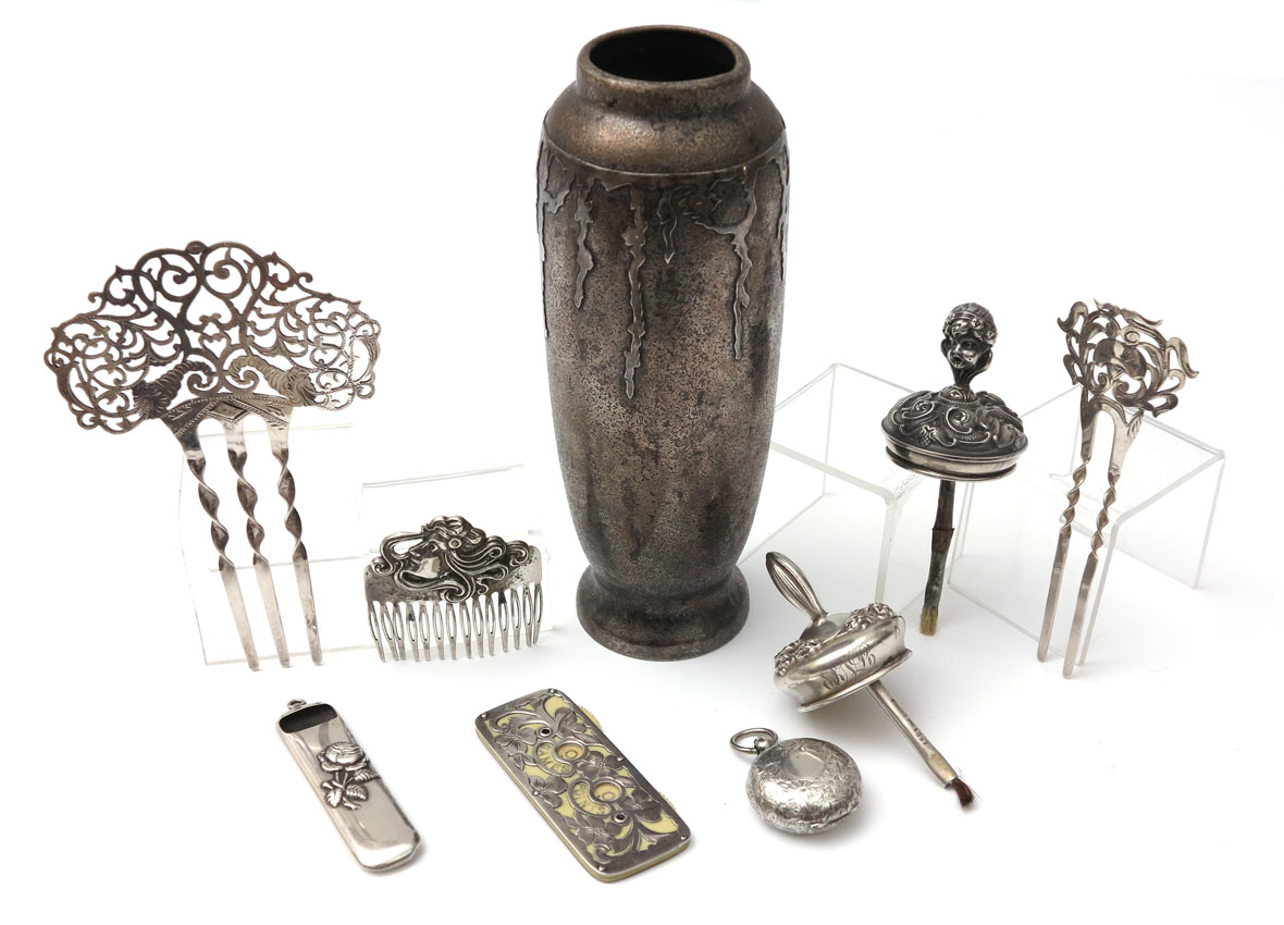 ESTATE COLLECTION OF ART NOUVEAU STERLING ITEMS: 9 pieces to include 1) Smith Metal Arts Co. vase, marked ''Sterling Decorated Bronze'', 7'' h., note bend to rim. 2) 3 hair combs, marked Sterling. 3) 1885 William Moulson English coin holder. 4) Whiting scoring device. 5) Mandalian Mfg small container. 6) Sterling lid mucilage jar floral. 7) Sterling lid mucilage jar cherub face for handle.