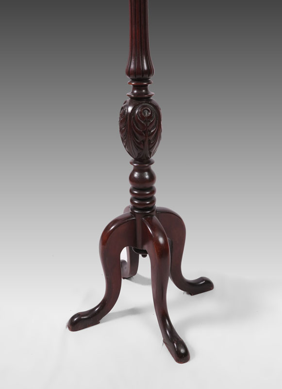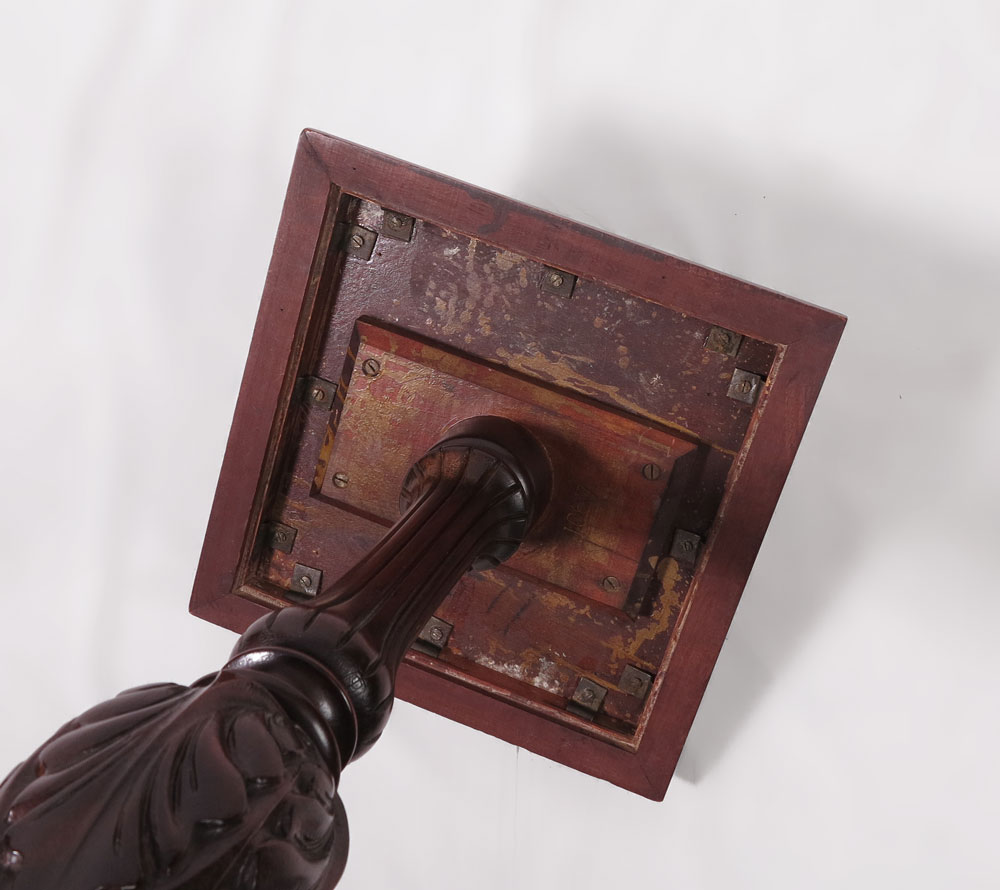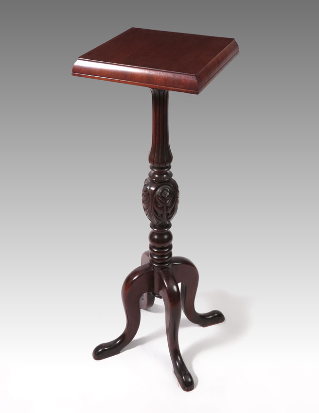MAHOGANY PLANT STAND: Square top over carved and turned body, on 4 splayed legs. 42 1/4'' h. x 13 1/2'' square.