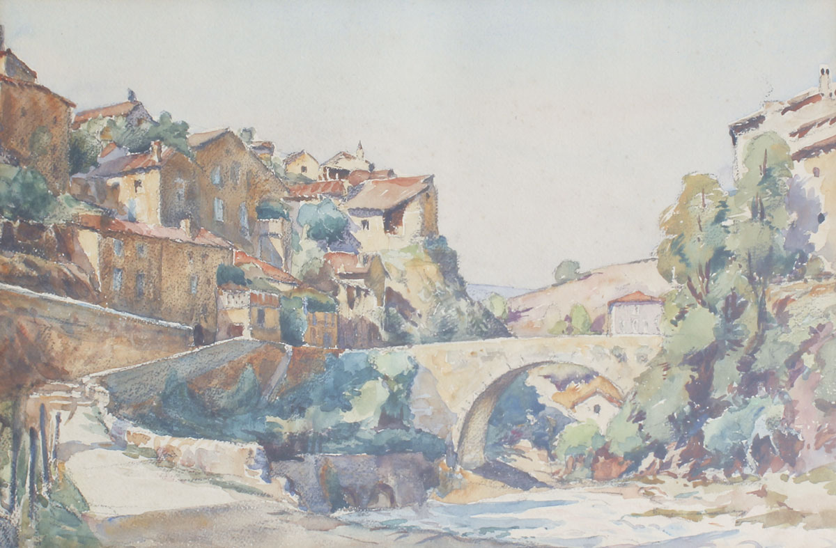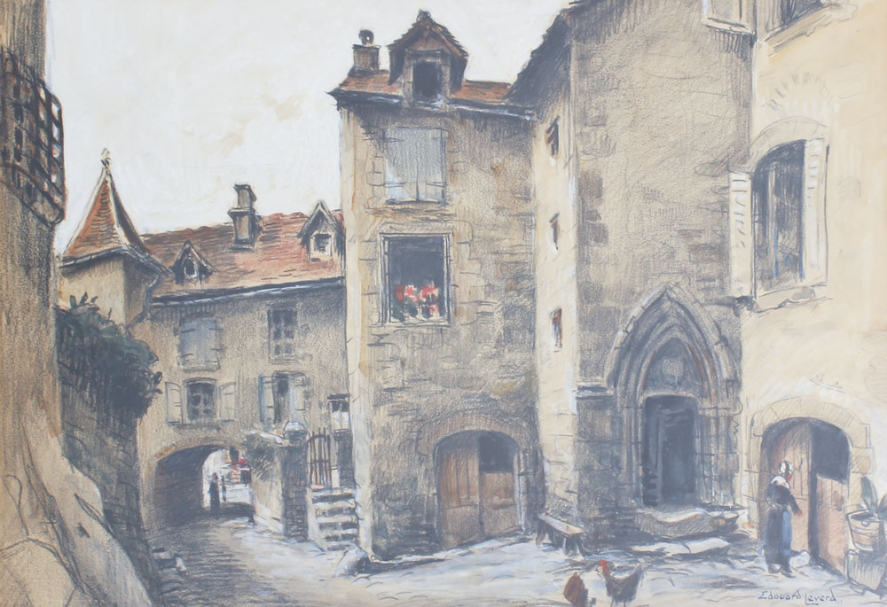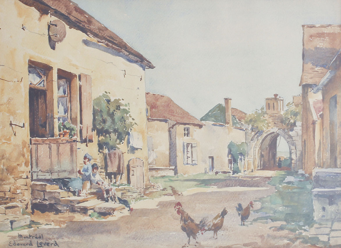 LEVERD, Edouard, (French, 20th Century): 3 piece lot to include; 1) ''Montreal'', Depicts a street scene with figures, sight size 9 3/4'' x 13'', signed lower right and titled, framed 17'' x 20''. 2) Unsigned and untitled, but believed to be by the same artist, depicts a town scene with aqueduct and river, Watercolor, sight size, 12'' x 18'', framed 18 1/2'' x 24 1/2''. 3) Town Scene with Figures, Pastel/Charcoal, sight size 12 1/4'' x 18 1/2'', signed lower right, framed, 19'' x 25''.