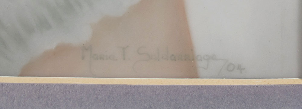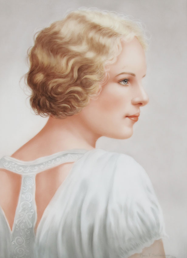 SALDARRIAGA, Maria, (American, 20th Century): Portrait of a 1920's Woman in profile on porcelain, signed lower right, sight size 8 3/4'' x 6 1/2'', contemporary framed and matted 16'' x 13 1/2''.