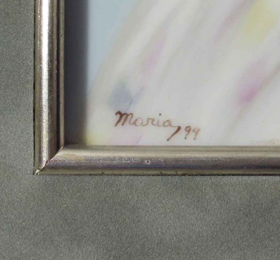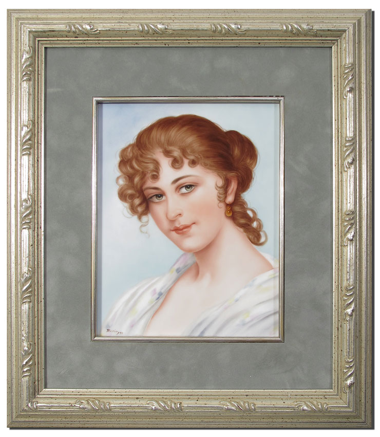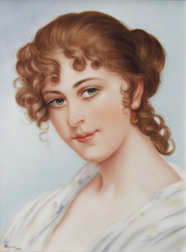 SALDARRIAGA, Maria, (American, 20th Century): Portrait of a Woman on porcelain, this piece has special significance as it was the first piece she ever did, signed lower left, sight size 9 1/4'' x 7 1/4'', contemporary framed and matted 17'' x 15''.