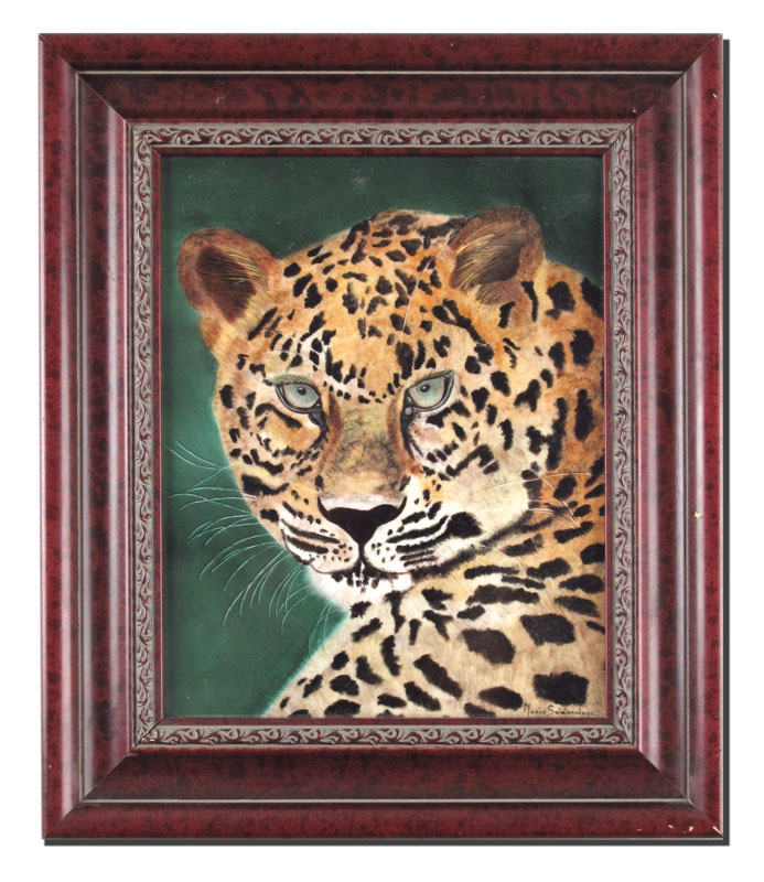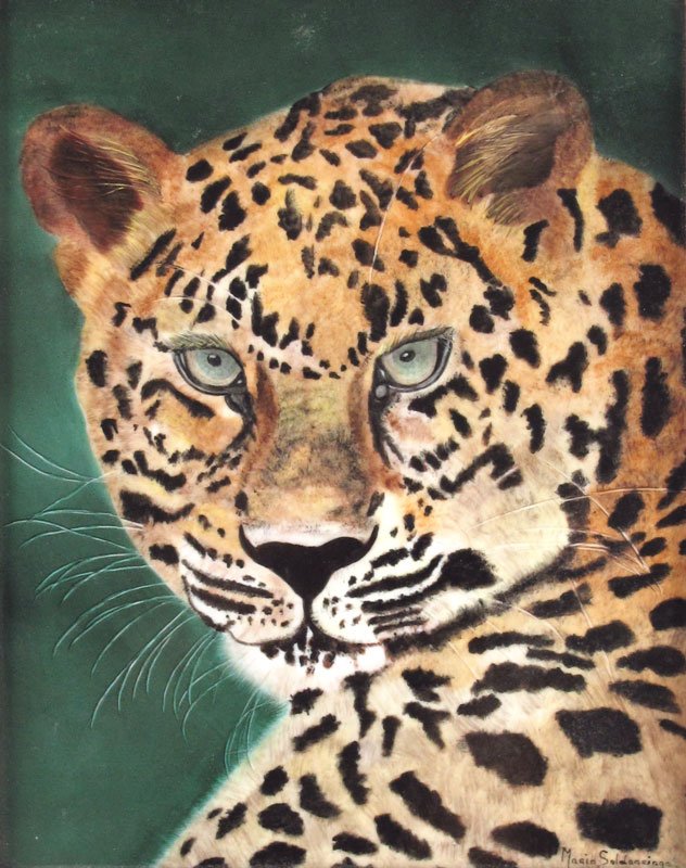 SALDARRIAGA, Maria, (American 20th C): Jaguar, Painting / Porcelain, 10'' x 8'', signed lower right, frame with wear, 13 1/2'' x 11 1/2''.