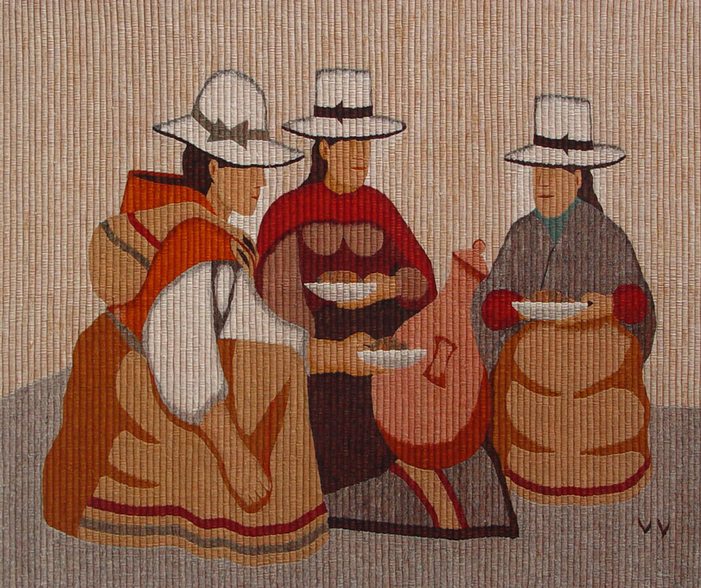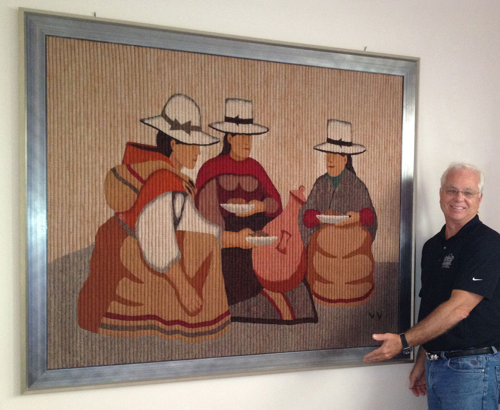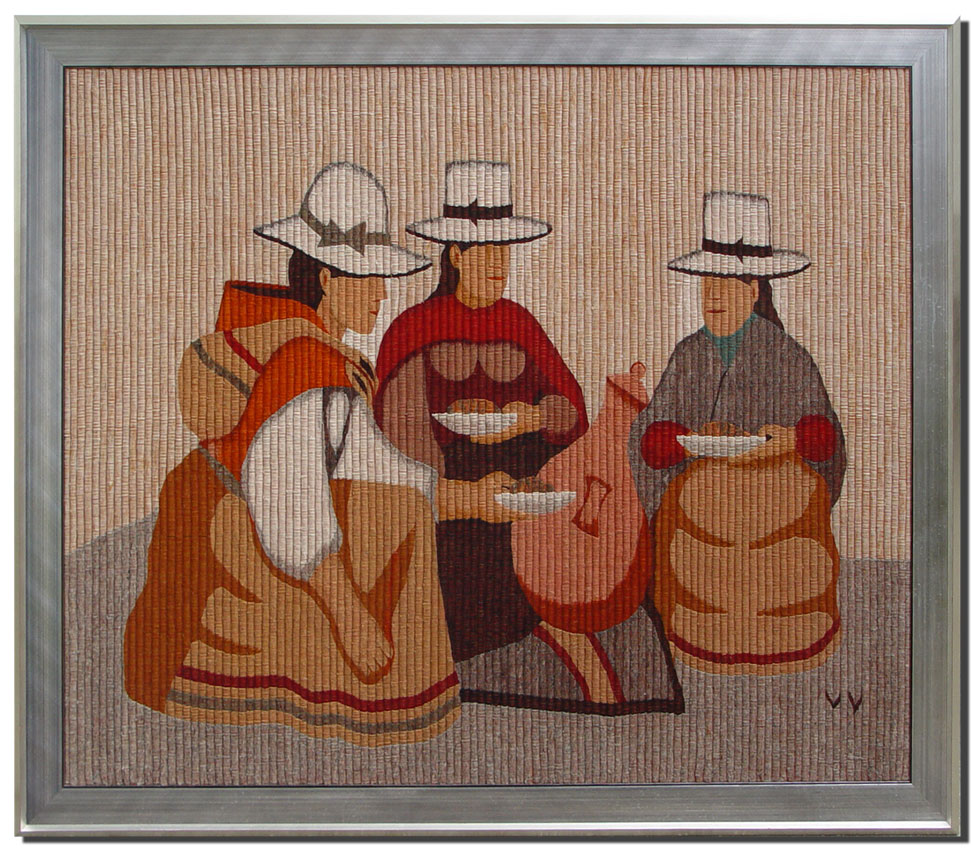 SAN PEDRO de CAJAS WOVEN PICTORIAL TAPESTRY: Artist signed VV, for Victor Vilchez. In Peru, in the village of San Pedro de Cajas the wool is sheared from their own flocks, hand carved and dyed from dyes rendered from local plants, roots, herbs and insects, rolled into long strands, ready to tuck weave. Framed 64'' x 55''. Sight size 57'' x 47''.