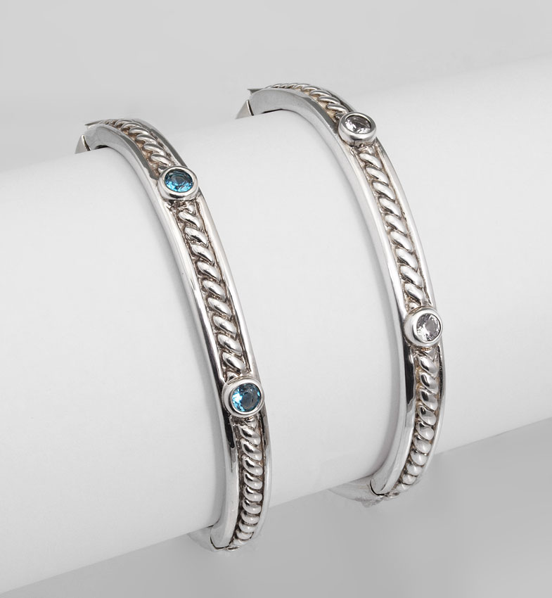 TWO JUDITH RIPKA STERLING BRACELETS: Two sterling silver hinged bangle bracelets in the original inner and outer boxes. 56.9 grams.