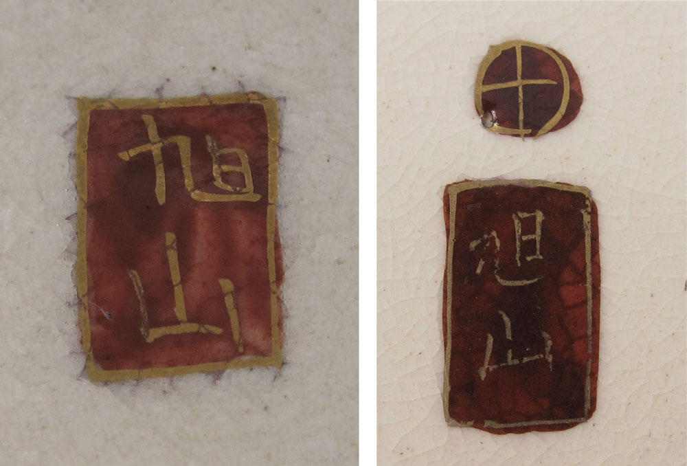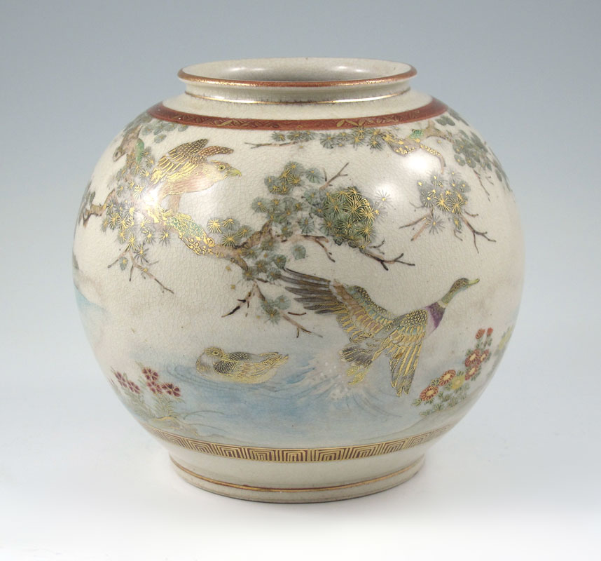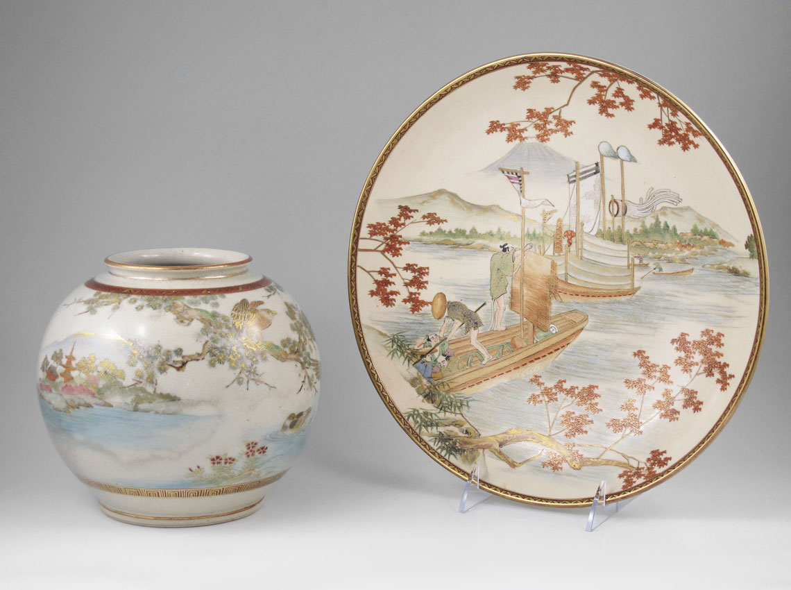 JAPANESE SATSUMA BOWL AND VASE: Finely detailed handpainted images, the bowl in a river scene, the vase with birds. Both pieces are signed. Bowl, 12'' dia. Vase, 7'' tall x 8'' dia.
