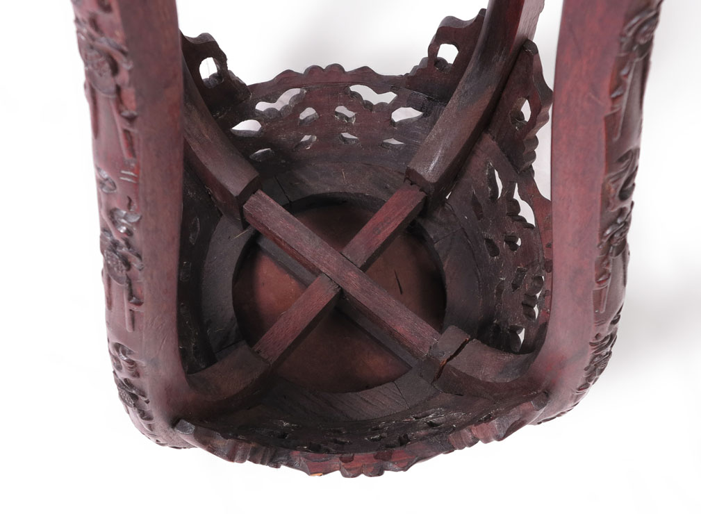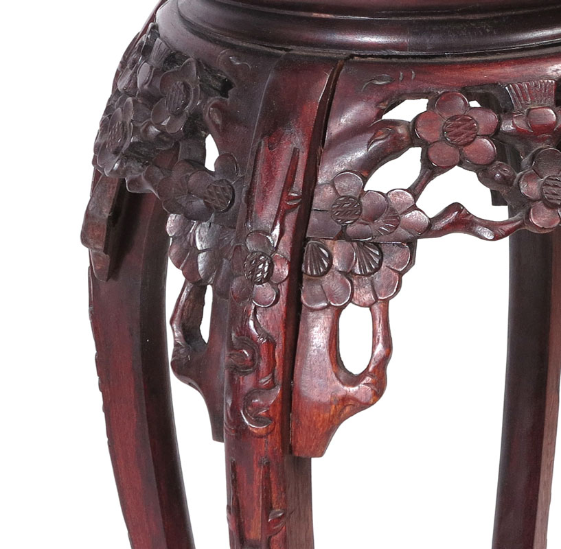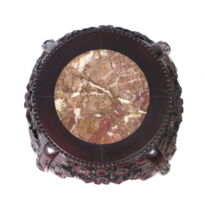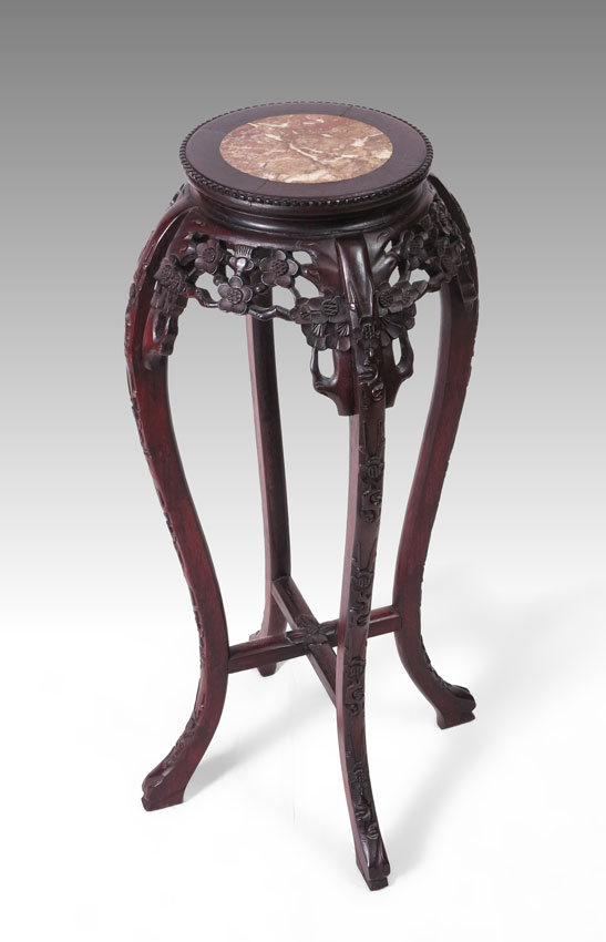 CHINESE CARVED MARBLE TOP FERN STAND: Inset marble top, carved and pierced skirt with carved legs and stretcher. 36'' h. x 18 3/4''.
