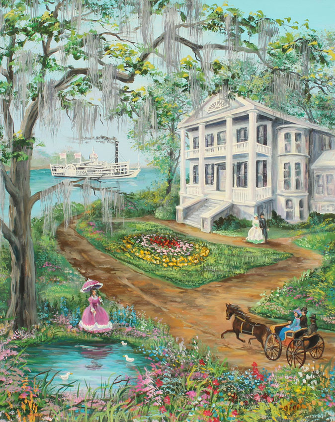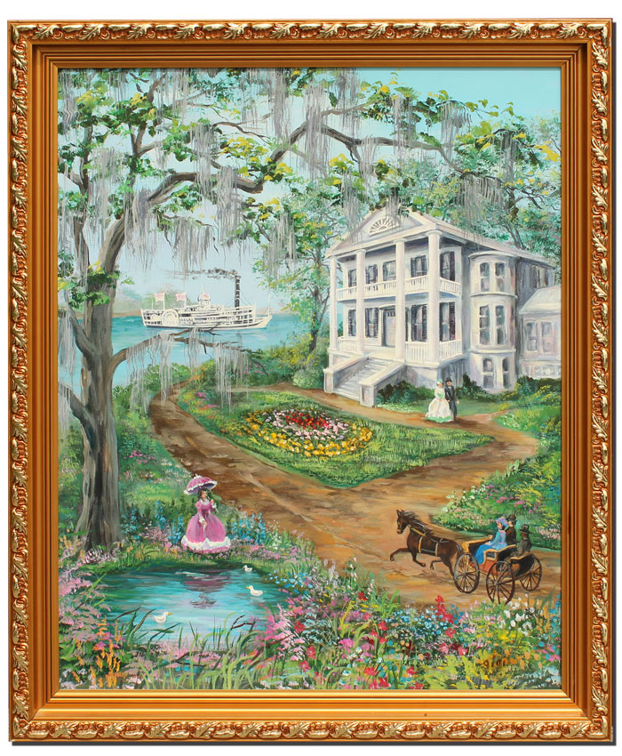 BEECHER, Betty (American, 20th Century): Steam Boat on the River with Plantation & Figures in the Foreground, a New Orleans Scene, Oil/Canvas, 30'' x 24'', signed and dated 1996 verso, gilded frame with wear, 34'' x 28''.