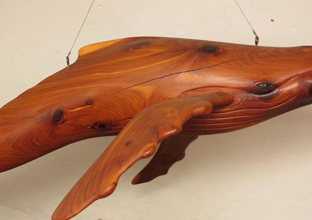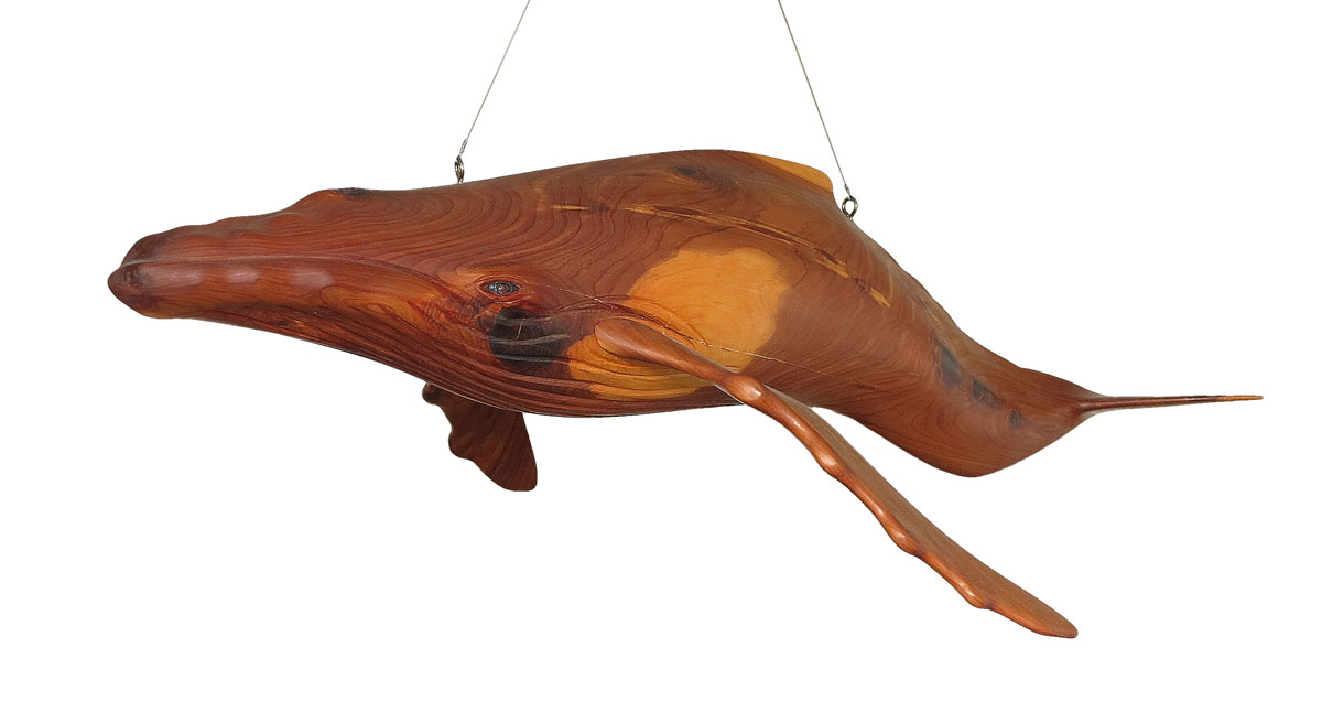 WYLAND GALLERIES CARVED WHALE SCULPTURE: Full body wood carving of hump back whale, approx. 43''l. Unsigned, purchased from the Wyland Gallery approx. 15 years ago.