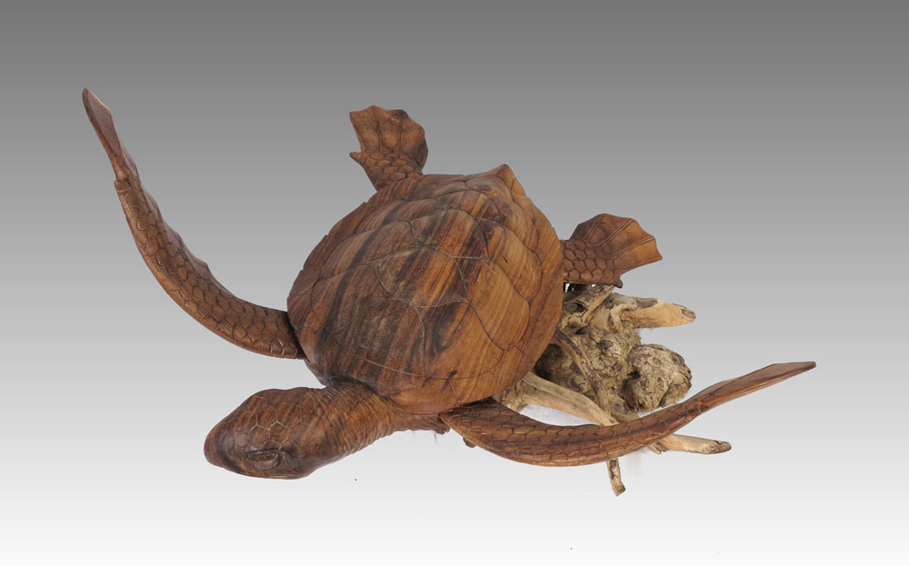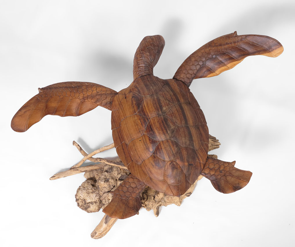 LIFE LIKE CARVED WOOD SEA TURTLE: On a driftwood base, the turtle appears to be swimming. He measures 24'' x 37''. The base alone is 24'' x 14''. For shipping purposes note the flippers do come off.