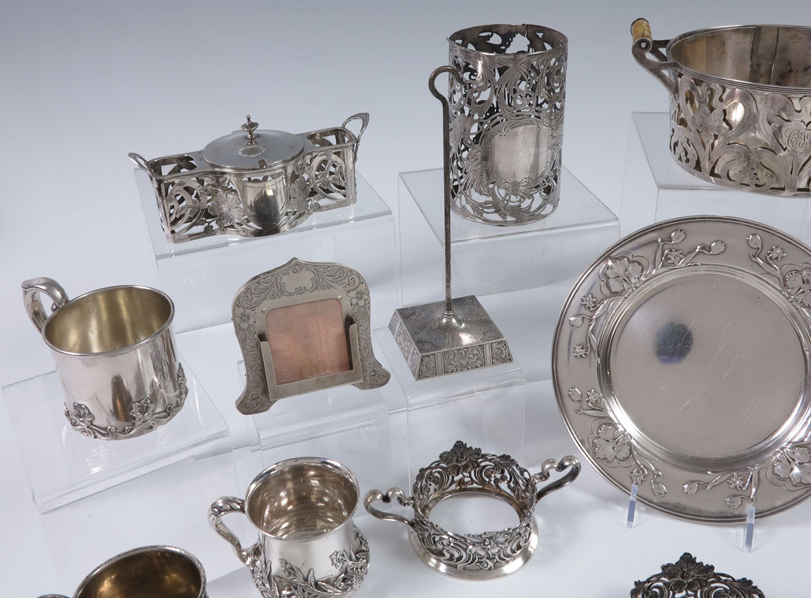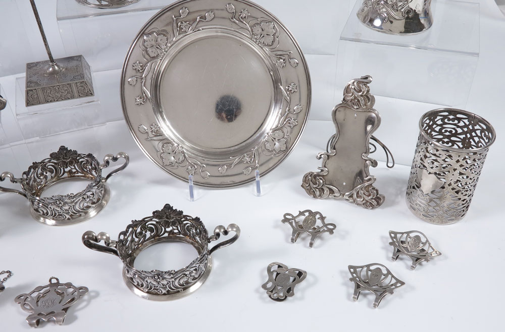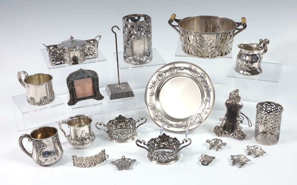 ESTATE COLLECTION OF ART NOUVEAU STERLING: An eclectic 19 pieces to include 1) Unidentified casserole holder with metal insert. 2) LaPierre cover for candle guard, note splits. 3) Frank Whiting cover for glass. 4) 5 napkin clips, various makers. 5) Gorham claret bottle label. 6) Bailey, Banks & Biddle calendar frame. 7) Kerr desk spindle. 8) Frank Whiting condiment holder, missing inserts. 9) Unger Brothers pair of sterling cup holders. 10) Gorham Aethenic pattern plate. 11) Baltimore sterling mug. 12) Kerr mug, engraved Thomas. 13) Gorham mug with applied flowers. 14) Hartford Sterling mug with applied flower. Some pieces monogrammed. Approx. 39.8 troy oz.