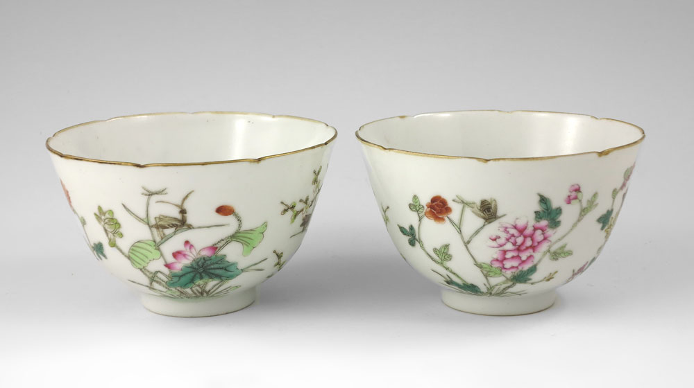 PAIR CHINESE FAMILLE ROSE BOWLS: Hand painted, 2 1/4'' tall, 3 3/4'' dia.